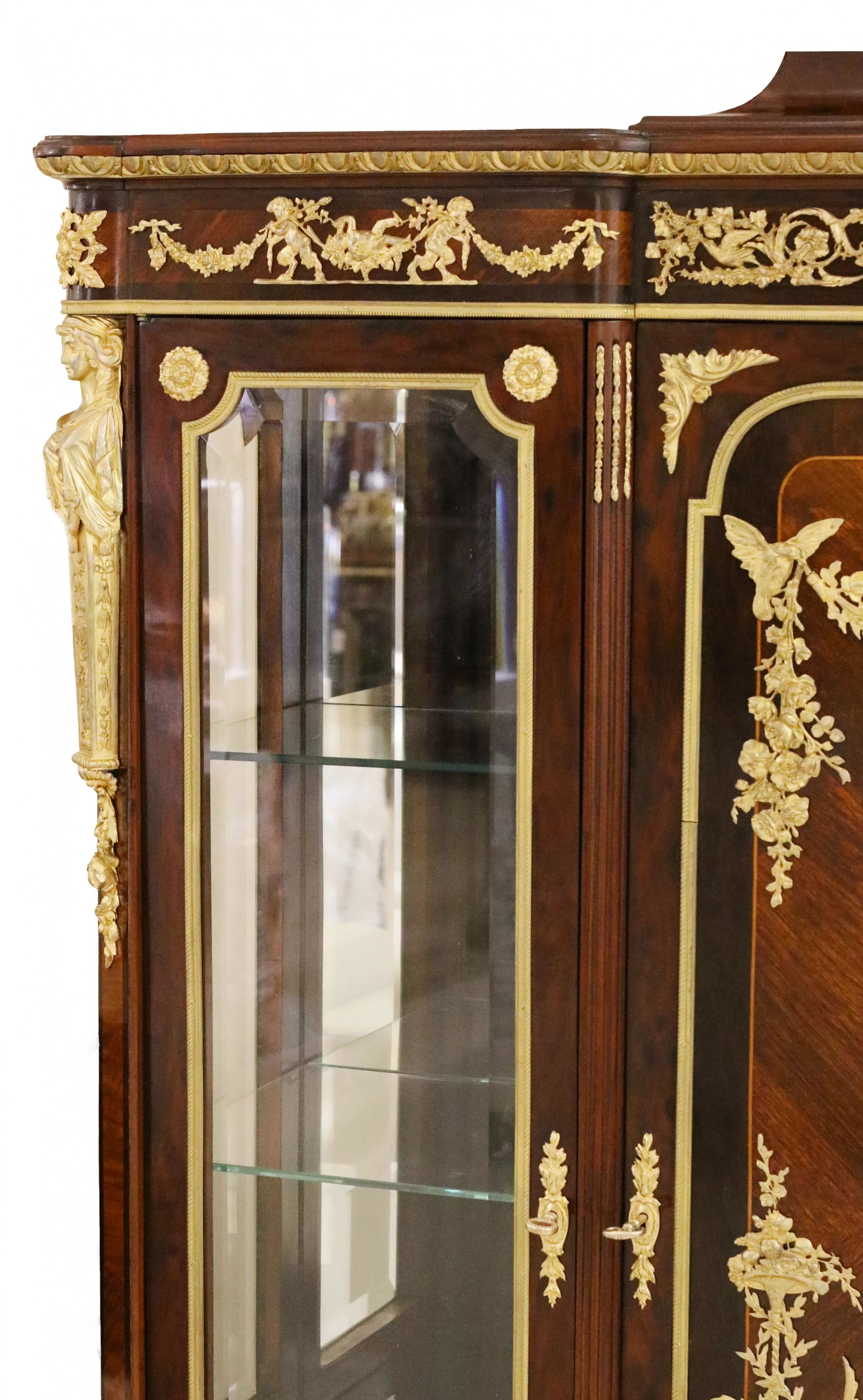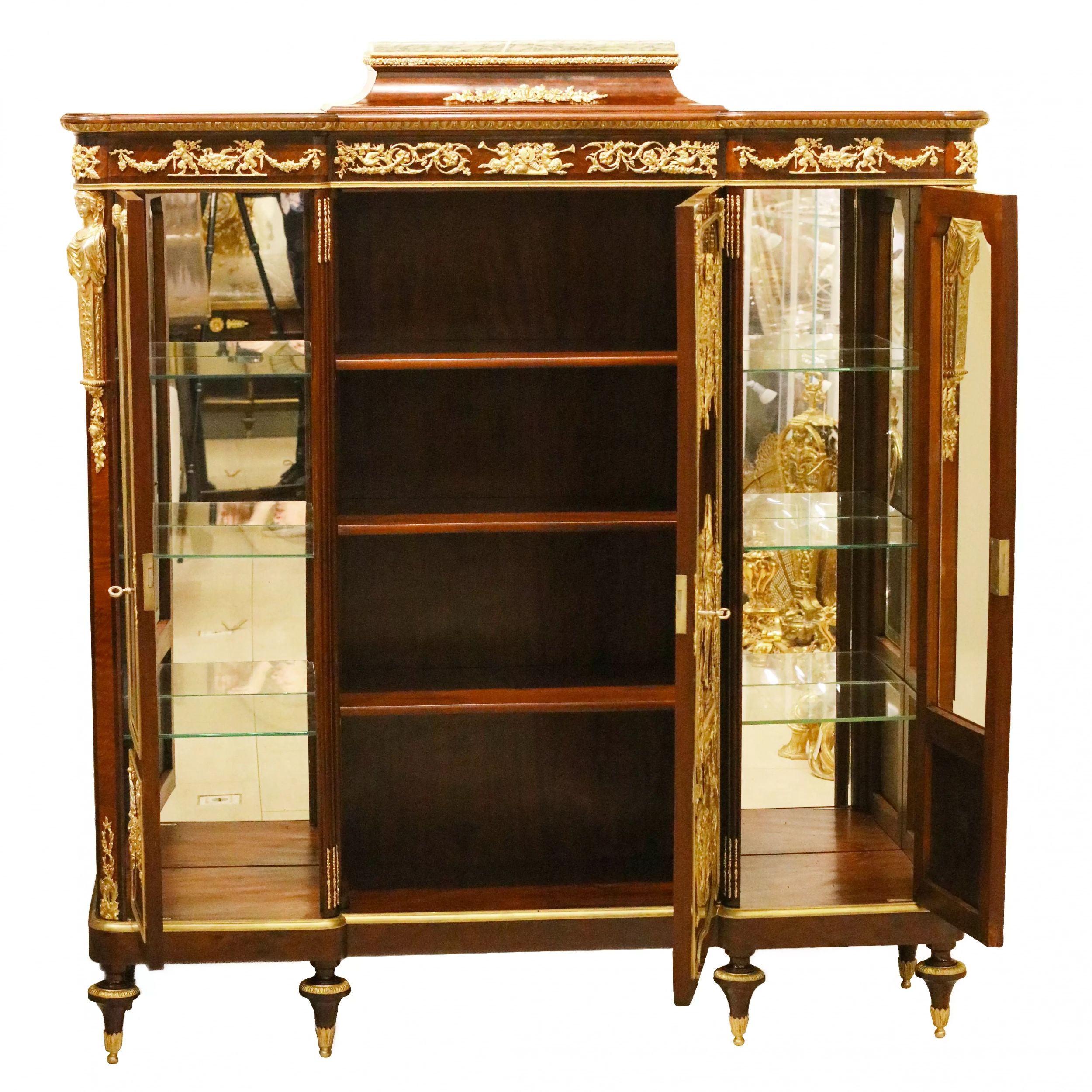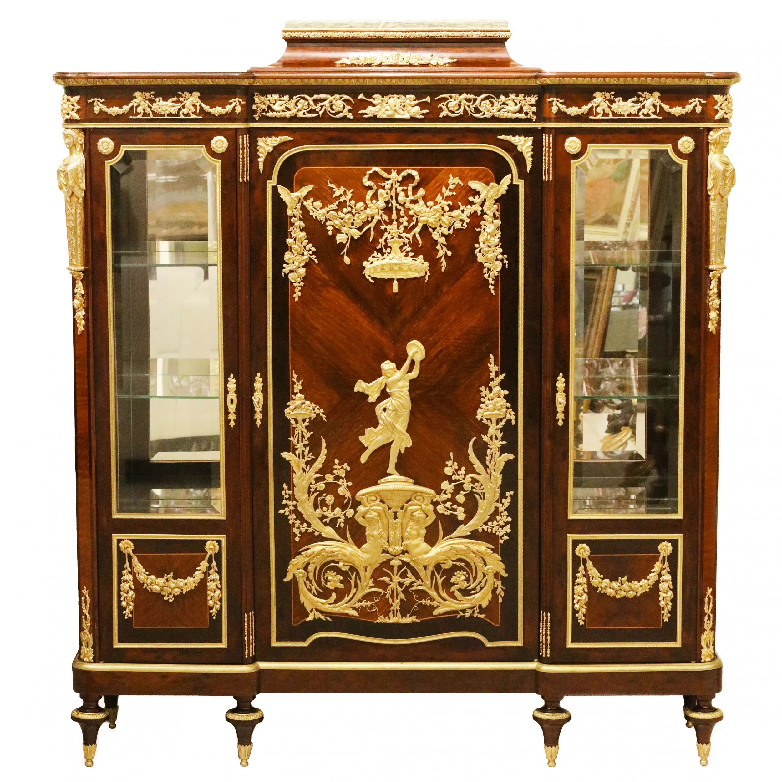 A magnificent three-bar display case created by the legendary French furniture workshop François Linke, personifying the luxury and sophistication of decorative art of the late 19th century. The product is made of noble mahogany and decorated with rich gilded bronze decor. The central door of the display case is an elegant composition of gilded bronze on inlaid wood with marquetry elements, demonstrating exceptional mastery of style. In the center is a graceful muse with a musical instrument, symbolizing the art of music. The muse rises on a pedestal in the form of a fountain, surrounded by figures of nymphs with fine detailing. The composition is complemented by ornate ornaments of plant motifs, garlands and vases filled with fruits of paradise. The upper part of the composition is crowned by a pair of birds of paradise carrying a flower garland with a central lampshade decorated with elegant roses and lilies. The upper frieze of the display case is decorated with garlands of flowers, playful satyrs and musical grotesques, creating a picturesque scene with elements of classical symbolism. The corners of the display case are decorated with massive decorative overlays in the form of mascarons with floral ornaments made of gilded bronze, giving the product solemnity and expressiveness. A distinctive feature is the finest embossing of decorative elements, detailed drawing of flower wreaths, emphasizing the elegance of the silhouettes of the panels. The upper part of the display case is completed with a marble tabletop made of light Carara marble with green veins, harmonizing with shades of mahogany and adding completeness to the overall image of the product. The side parts of the display case are made with glass doors with chamfers, emphasizing the elegance placed above the panels of the inlaid wood decorated with flower garlands. Inside the display case there are glass shelves against the background of mirrors, creating space for the exhibition of collectibles. The display case rests on elegant legs decorated with decorative gilded elements, completing the harmonious image of the product. Dimensions: 164 x 145 x 40 cm. France, late 19th century.