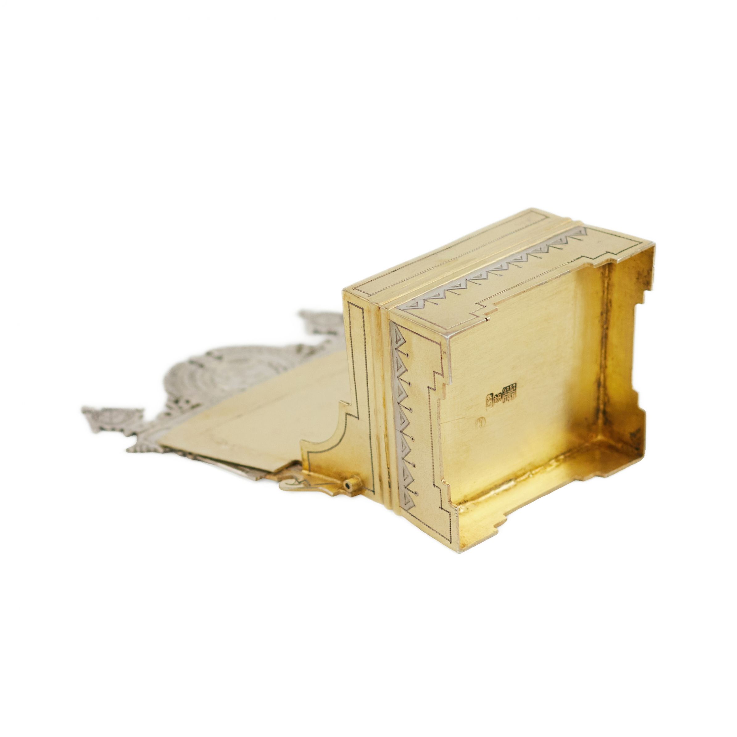 The composition is conceived as a miniature architectural model. The body has a строг rectangular form with a pronounced plinth and stepped base, decorated with engraved geometric ornament. The interior is fully gilded, in accordance with the sanitary requirements of the period and the established tradition of decorating silver salt cellars.