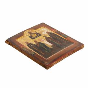 AUCTION OF RUSSIAN AND EUROPEAN ART No. 15 · Part IThe icon is painted in the traditional iconography of the Mother of God “The Sign”, depicted in the upper part of the composition in a half-length figure with hands raised in prayer and a medallion of Emmanuel on her breast, symbolizing the Incarnation of the Word. The composition is complemented by a row of standing saints arranged frontally against a gilded background, emphasizing the liturgical and intercessory nature of the image. The central grouping forms a solemn symmetry characteristic of Russian icon painting of the second half of the 19th century, with a clear hierarchy of figures and distinctly legible silhouettes. The painting is executed in tempera on gesso with a gilded ground. The palette is restrained, dominated by ochre, green, and cinnabar tones. The faces are softly modeled with gradual highlights, reflecting the academicized tradition of late icon painting. The borders are painted and accentuated with a red outline.