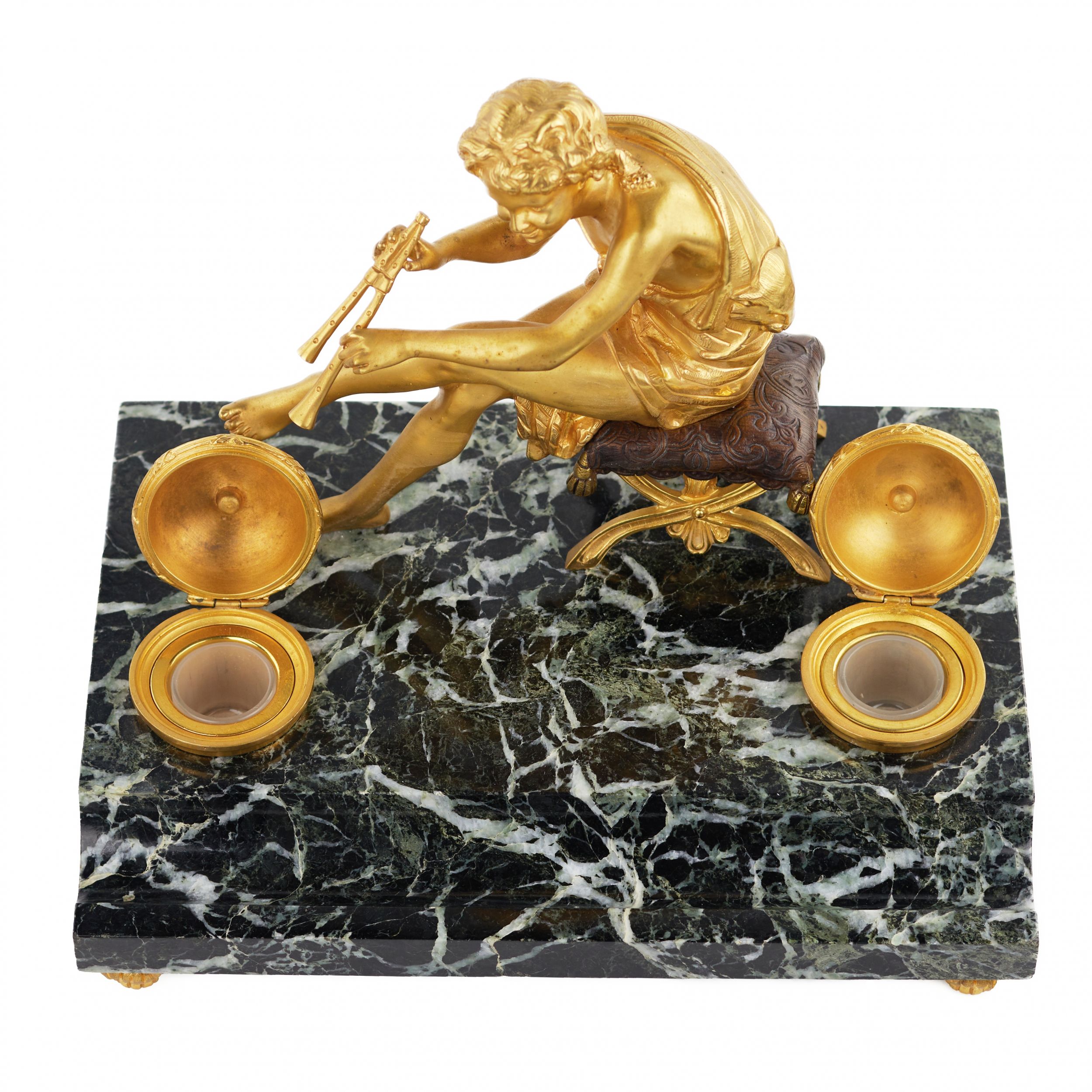 AUCTION OF RUSSIAN AND EUROPEAN ART No. 15 · PART IIA large desk inkwell executed in the French Neoclassical tradition of the early 19th century, featuring an expressive sculptural composition depicting the god Pan seated on a stool and playing the double flute (syrinx). The figure is conceived in a refined, intimate manner characteristic of post-Napoleonic Neoclassicism, with emphasis on harmonious proportions, fluid lines, and a poetic interpretation of an Antique subject.