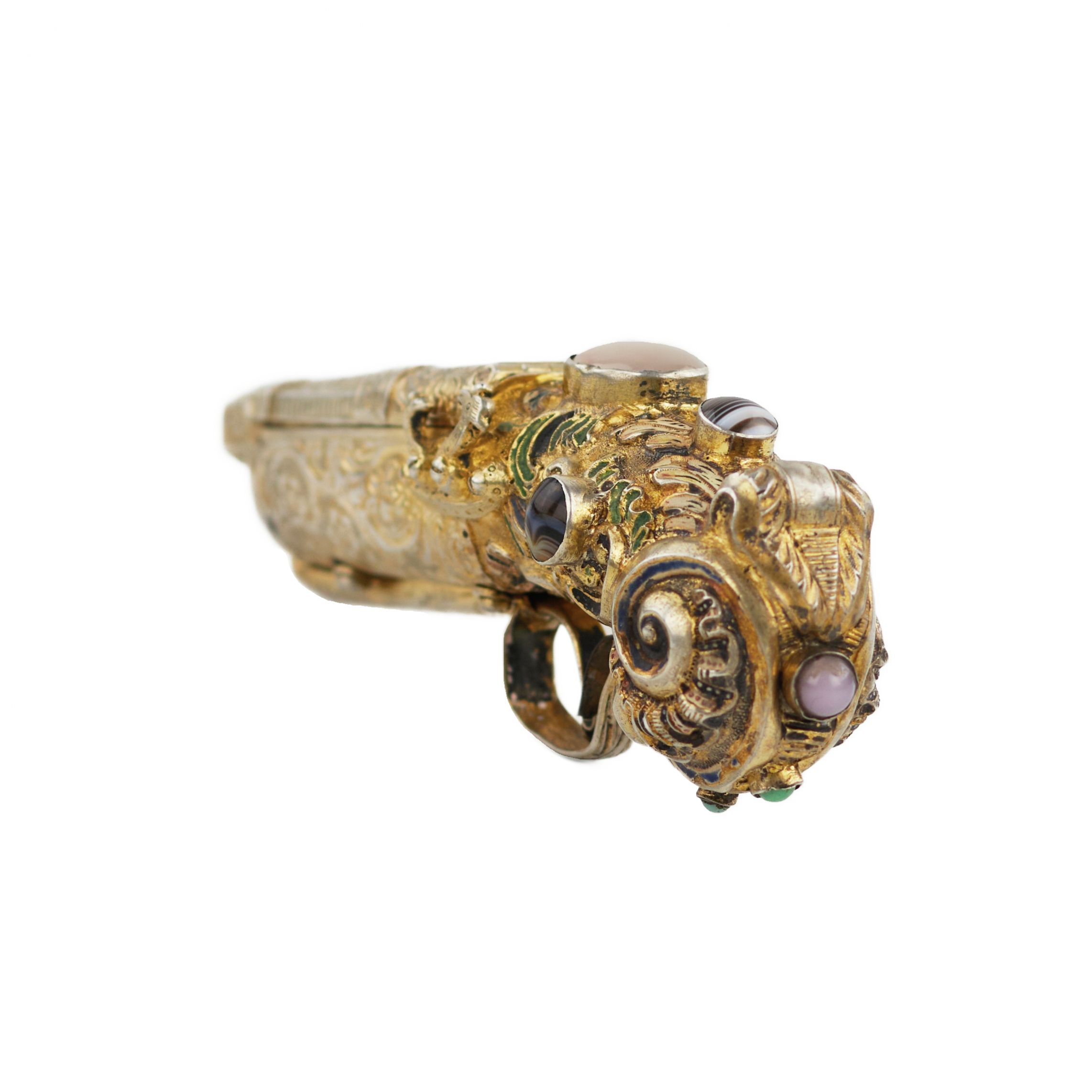 The mechanical part of the object is stylised after the construction of a firearm: the hammer and trigger guard form an original mechanism that activates the opening system of the snuff box. The hinged lid opens to reveal the internal chamber intended for storing tobacco. The interior surface is fully gilded and decorated with engraved ornament, in accordance with traditional snuff box manufacture and serving to protect the contents.