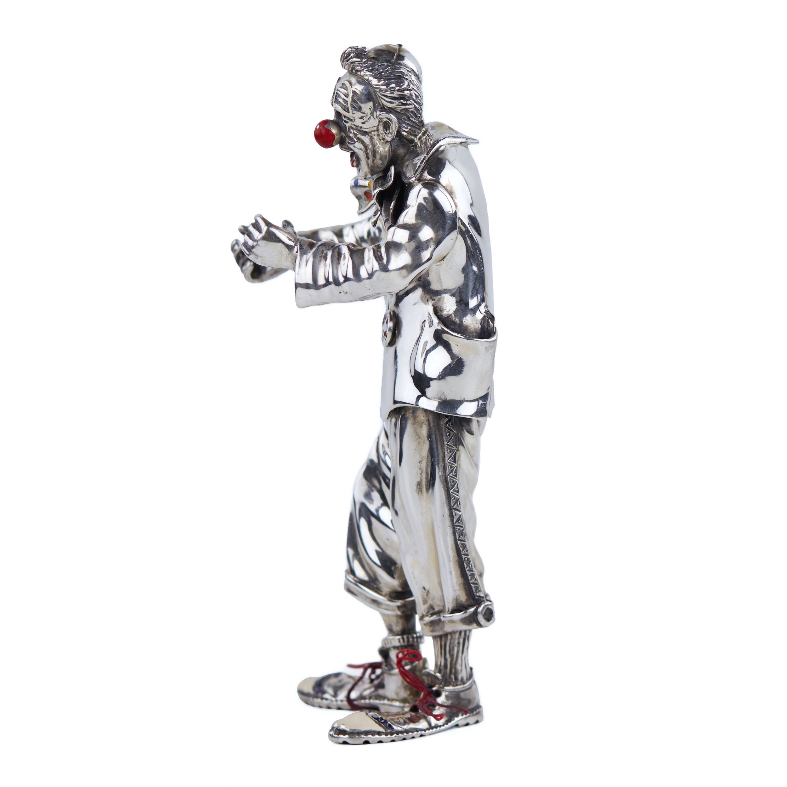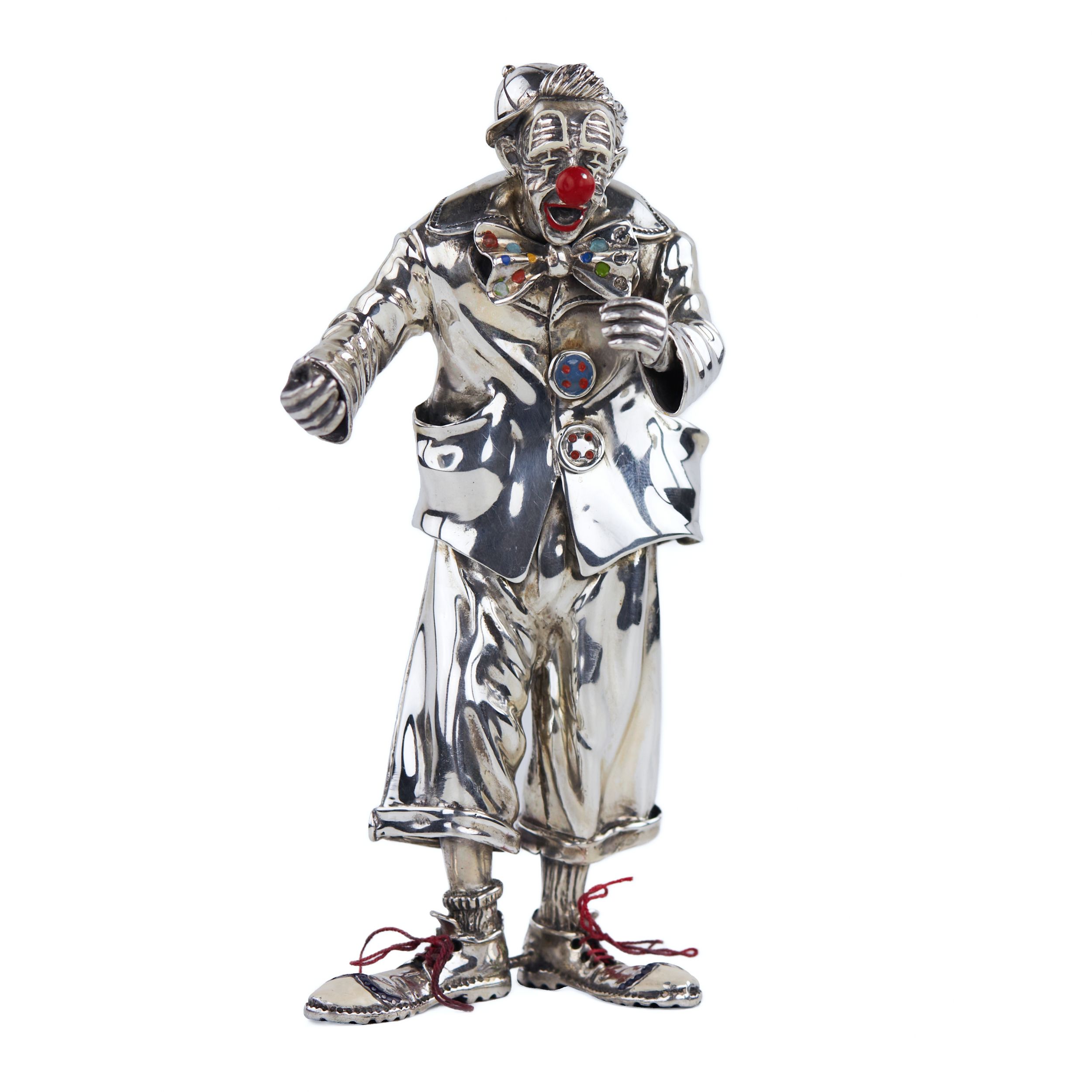 Stylistically, the work belongs to the tradition of decorative cabinet sculpture produced by Italian silversmith workshops in the second half of the 20th century, which frequently explored themes of circus art and comic stage imagery. Such figures were intended as decorative interior objects and collectible works, combining refined silver craftsmanship with expressive genre sculpture.