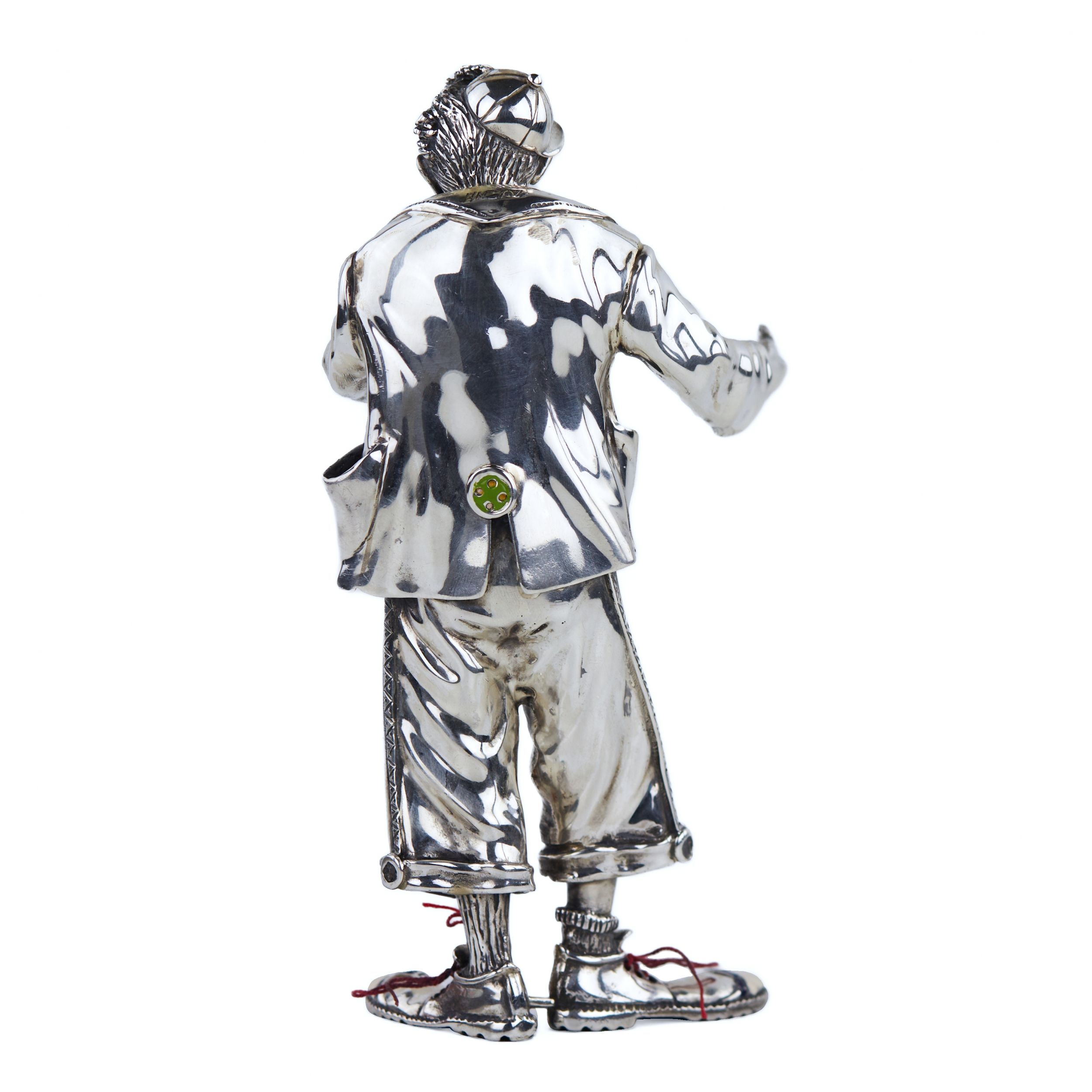 AUCTION OF RUSSIAN AND EUROPEAN ART No. 15 · PART IIAn expressive silver cabinet figure of a clown created by the Italian jewellery workshop Ancini in the second half of the 20th century. The sculpture depicts a comic circus character dressed in a characteristic costume: shortened trousers, a loose jacket with large decorative buttons, and a large bow tie decorated with coloured enamel inserts. The face of the character is rendered in a grotesque theatrical manner with exaggerated expression: a widely opened mouth, accentuated wrinkles, and a bright red nose, the traditional attribute of a circus clown.