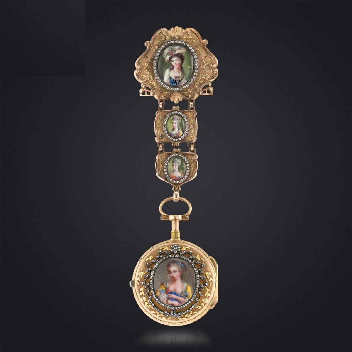 Extremely rare 18th century Swiss watch, crafted in 18K multicolor gold, set with diamonds and hand-painted on enamel, with open dial and lock. Gilded bezel movement, fusee chain, detachable watch case with hand-painted petite girl, multicolored gold embossing, high relief floral decoration with diamonds, button set with diamonds. Watch with a white enamel dial, Roman numerals, external Arabic five-minute markers, surrounded by a bezel of old-cut diamonds. Chatelaine in gold and diamonds of different colors, decorated with painted enamel plates with portraits of women, on which hang a later key and safety pin, hinge clip on the reverse, mechanism signed by JS Patron, Geneva and number 6038, made around 1770, lock with French guarantee mark in 18-karat gold (eagle head).