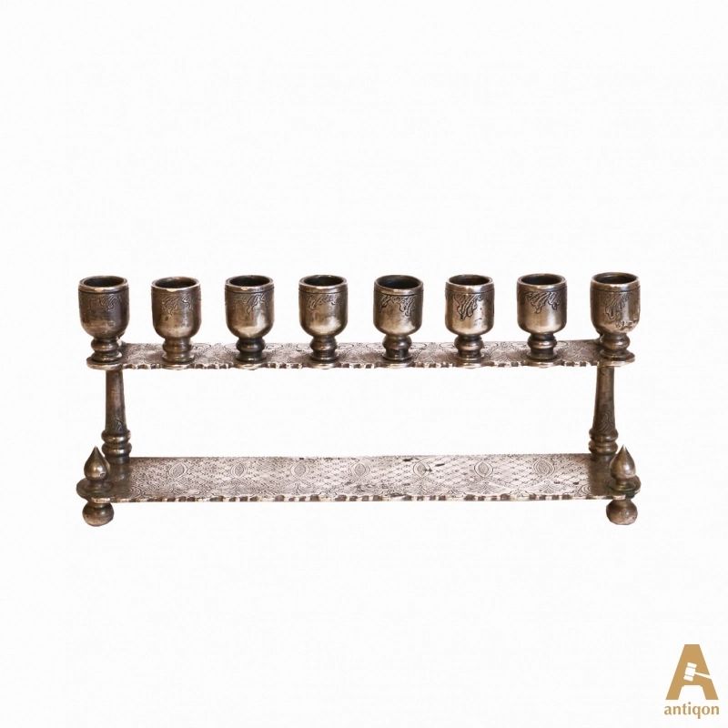 Hanukkah (Hebrew חֲנֻכִּיָּה) or Hanukkah Menorah (Hebrew מְנוֹרַת חֲנֻכָּה, "Hanukkah lamp") is a eight-branched candelabrum lit during the eight-day holiday of Hanukkah, as opposed to the seven-branched menorah used in the ancient Temple or as a symbol. Hallmarks: Two-headed eagle"84" in the oval - silver markmaster mark "ВС" presumably Victor Savinkov (Виктор Савинков 1855-1888), number 1863 - Year of manufactureSt. George the victorious turned to the right in a rectangle with bevelled edges corresponding to the period 1856-1869 (hallmarks book Postnikova-Loseva- ММ.Постникова-Лосева)Total weight - 1036 gr.