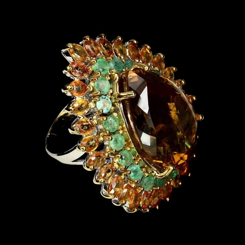 Изумительное Коктейльное кольцо с крупным цитрином, усыпанное изумрудами и сапфирами .Серебро 925 пробы, 1 цитрин, 19 изумрудов, 28 желтых сапфиров. Размеры: Высота 4 см, Вес: 21 грамм. Геммологическая экспертиза.