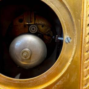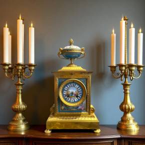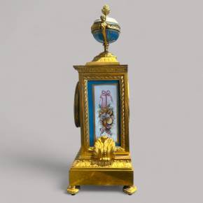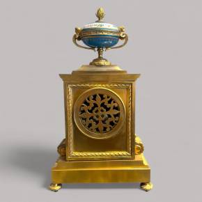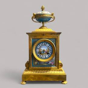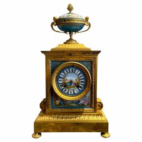Elegant mantel clock in gilt bronze and hand-painted porcelain, crafted in the Louis XVI style and dating from the 19th century.The rectangular gilt bronze case is adorned with acanthus motifs, twisted friezes, and rests on turned feet. The clock is topped with a classical urn in turquoise blue porcelain, decorated with hand-painted flowers, foliate handles, and a gilded pinecone finial.The porcelain dial features cobalt blue Roman numerals on a white background, surrounding a pastoral scene depicting a romantic encounter in a countryside setting. An additional plaque beneath the dial illustrates a complementary figurative scene in soft tones, adding a narrative touch to the piece.This clock stands on a solid base, combining stability with elegance. The subtle contrast between the vivid blue tones, delicate pastels, and the brilliance of the gilt bronze makes it a remarkable decorative object, ideal for a mantel, console, or display cabinet.The gilt bronze details (acanthus, twisted friezes, foliate motifs) reflect the high quality of the ornamental work and the care taken in its finish.Very good overall condition, with well-preserved gilding showing minor signs of age and a small chip on the dial.