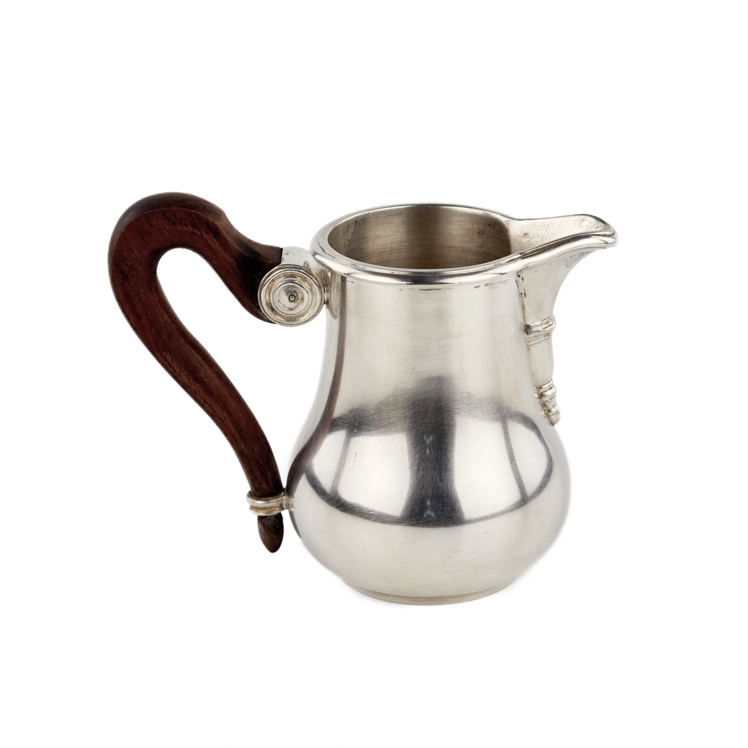 French tea and coffee service in silver plated metal. Paris. Puiforcat. A full-fledged service in cozy baroque forms with wooden handles. Consists of: coffee pot, teapot, sugar bowl and milk jug. Coffee pot height: 23 cm. 19th-20th century. Emile Puiforcat and his eldest son Jean Puiforcat are known from 1857 to 1945. Both branded products with one hallmark.