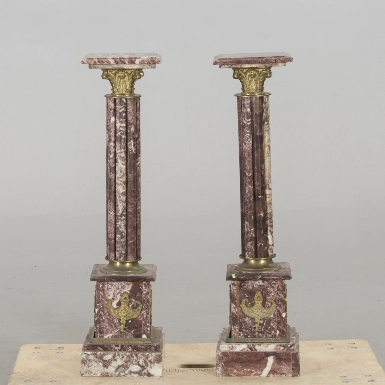 Пара мраморных колонн, украшенных элементами художественной бронзы.