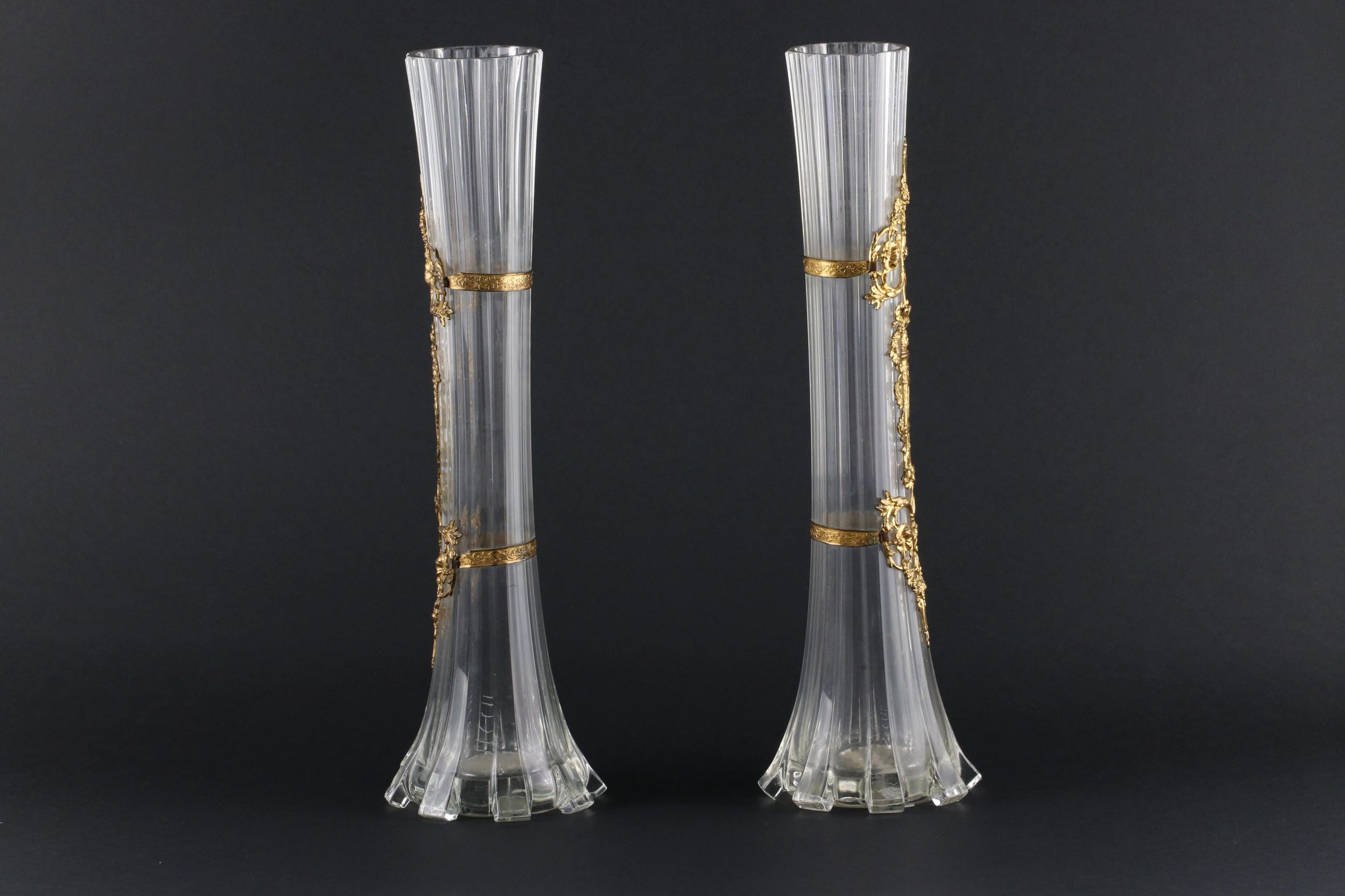 Пара ваз, украшенных художественным орнаментом из позолоченного метала.