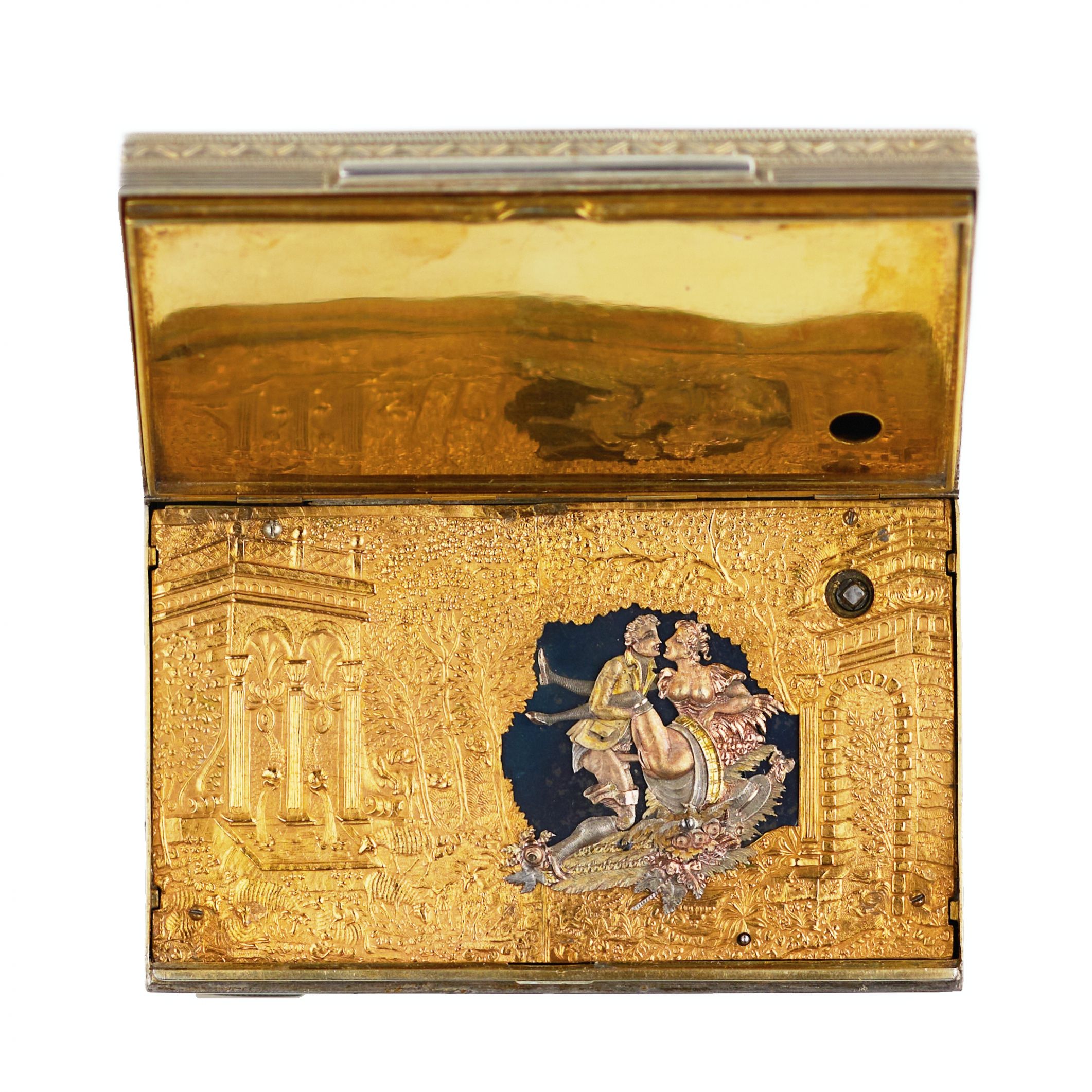 The interior is richly gilded and decorated with a relief composition depicting a pastoral landscape with architectural motifs and decorative elements inspired by Neorococo aesthetics. At the centre is a movable figurative scene showing a couple dressed in 18th century costumes, executed in polychrome metal against a dark contrasting ground. When the mechanism is wound, the scene animates to musical accompaniment, creating the effect of a theatrical miniature and emphasising the playful, gallant character of the object.