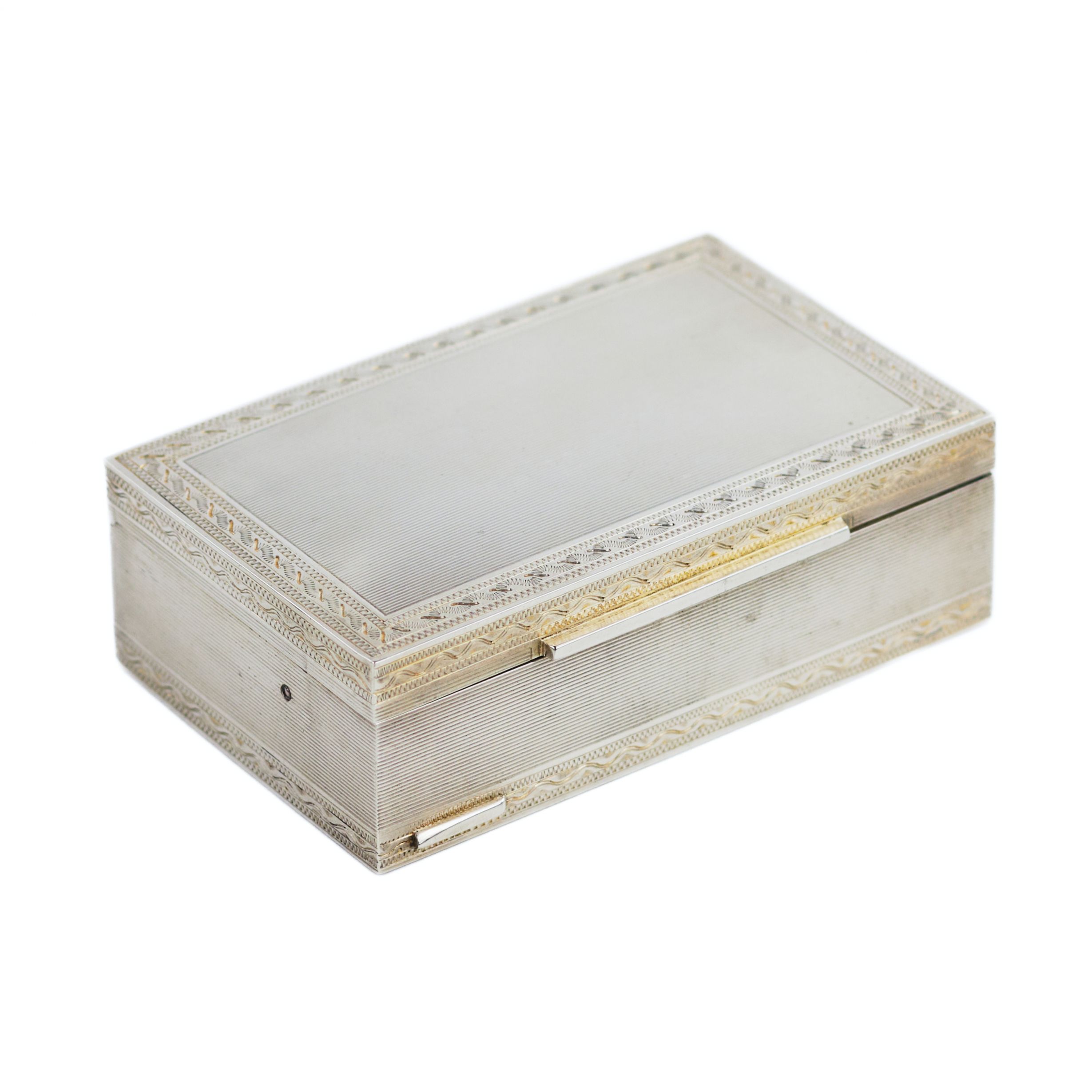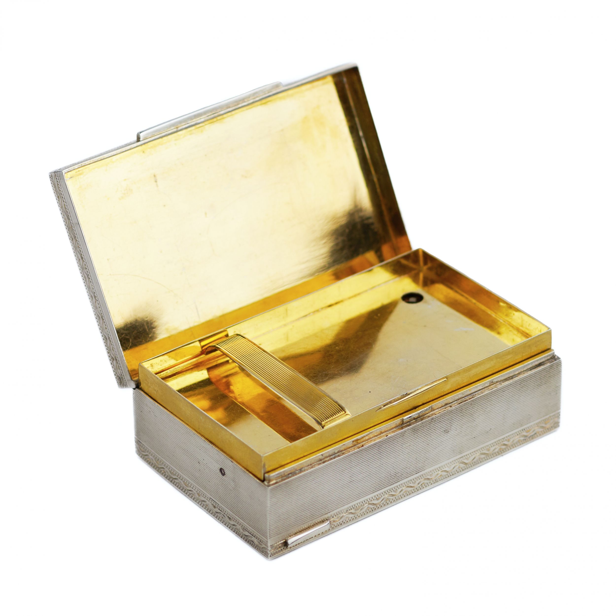An elegant silver musical box with an automatic mechanism, combining the functions of a cigarette case and a mechanical miniature scene. The rectangular case is crafted in 800 standard silver, featuring fine guilloché decoration and an ornamental border along the edges of the lid and body. The upper section opens to form a gilded cigarette tray, beneath which the musical mechanism is concealed.
