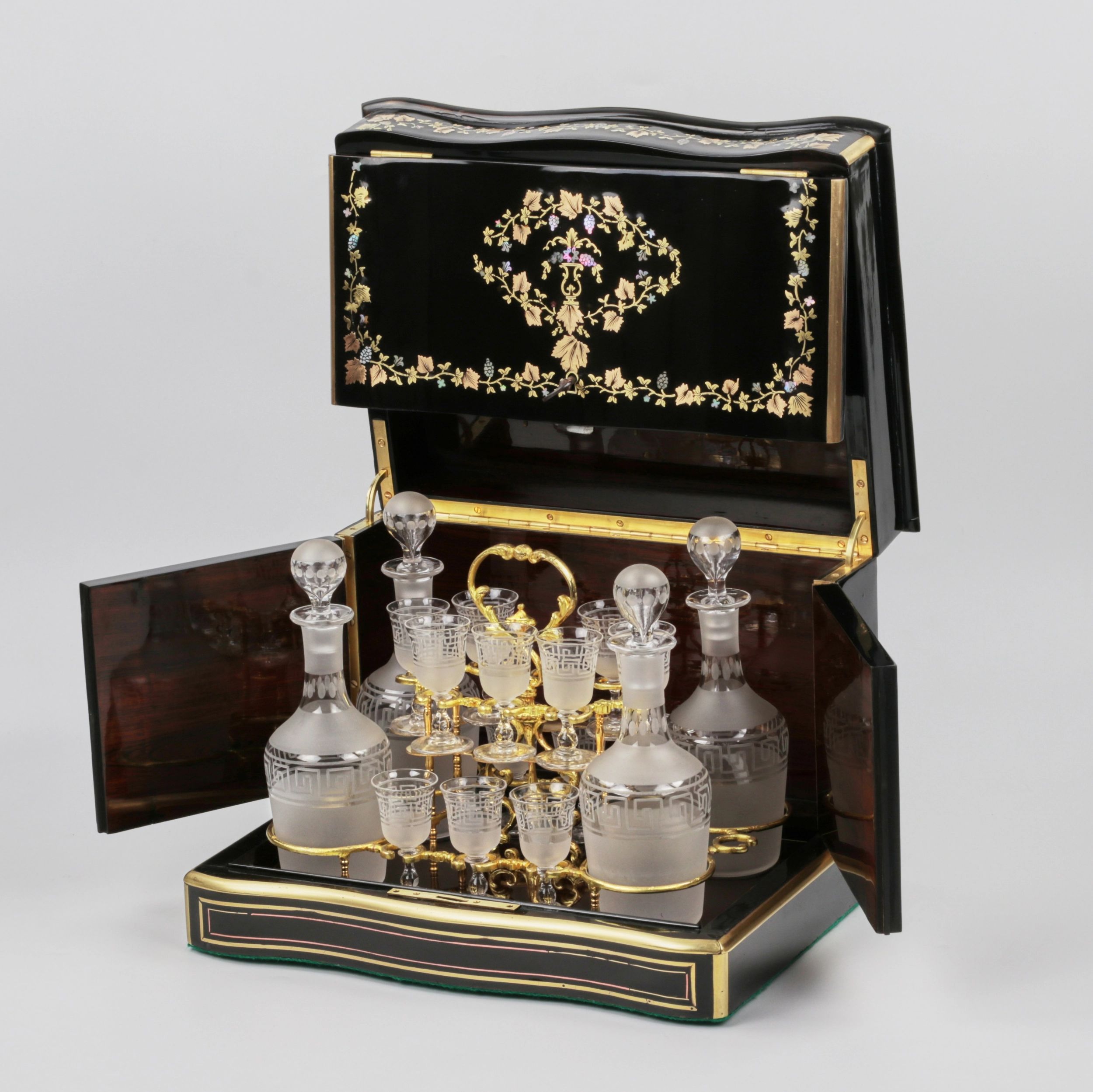 Road bar. 1870s. Austere, ebony with a wave along the front - case, with grapevine belts of mother-of-pearl and brass marquetry. Inside, on a rocaille stand, is a set of four liquor bottles and thirteen frosted glasses with an engraved meander pattern.