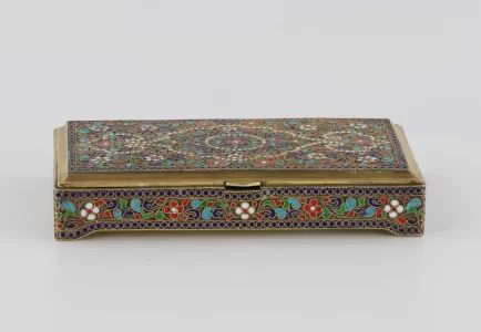A silver box in the neo-Russian style (possibly for cigars) 1890-1920, richly decorated with enamel floral pattern on a golden porcelain background. The belts of the blue pearl emphasize the background of the scanned ornament, in the form of an oriental carpet pattern. The inside is gilded.