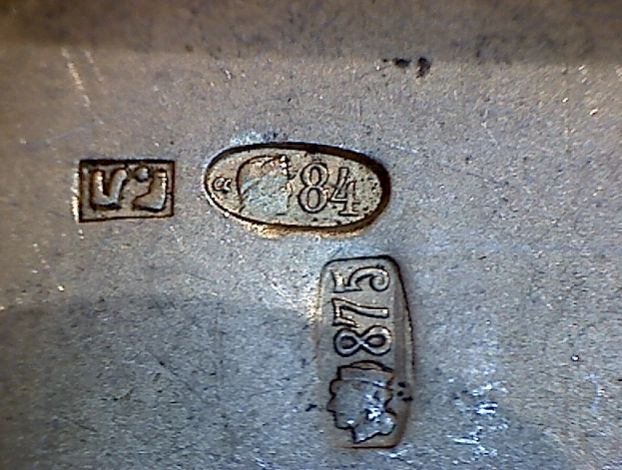 Клейма: Именник мастера Г.Л - неизвестный мастер, цифры "84", голова девушки повернутая в право и альфа - Петербургское пробирное управление 1908-1917 гг. цифры "875" в бочке с головой латвийской девушки в верх соответствующее внутреннему латвийскому клейму 1922-1927гг