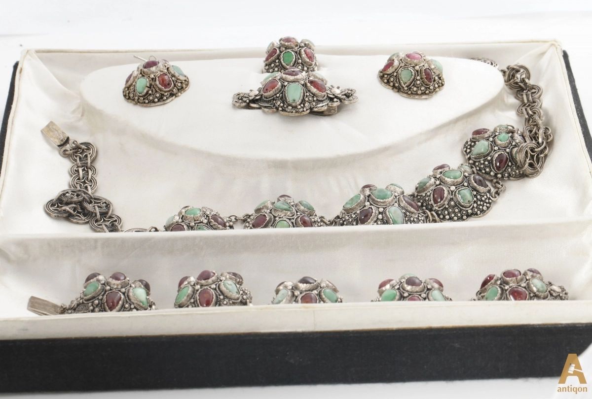 Delicious silver set consisting of six items: necklace, bracelet, brooch, ring, pair of earrings. Technique of filigree, decorated with semi-precious stones, Garnets and Onyxes.