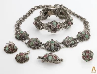 Восхитительный серебряный гарнитур, состоящий из из шести предметов: ожерелье, браслет,брошь,кольцо,пара сережек, выполненные в технике филигрань, украшенные полудрагоценными камнями Гранат и Оникс, огранки кабошон. Клейма: Пробирные клейма Швеции для ввозных изделий: «Три короны» на рифленом фоне в овале - клеймо для изделий из драгметаллов, импортируемых в Швецию;удостоверяет, что изделие выполнено из драгметалла, проба которого не ниже минимального стандарта,принятого в стране. Буква «S» на рифленом фоне в пятигранном щитке подтверждает, что изделие выполнено из серебра не ниже принятого в стране стандарта, который соответствует 830 пробе.Размер кольца 17,5/55. Общий вес 146,4 гр.