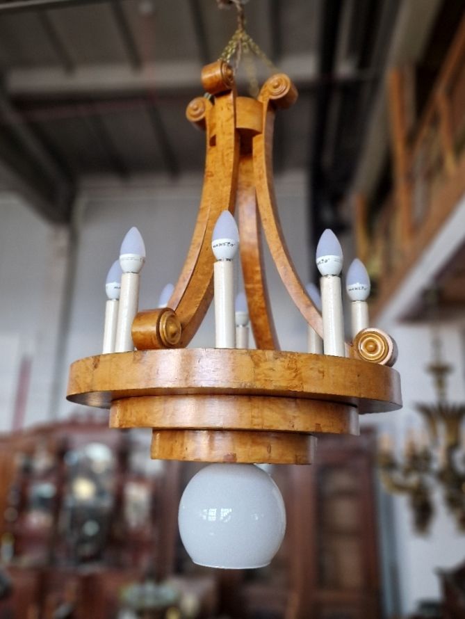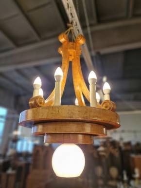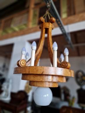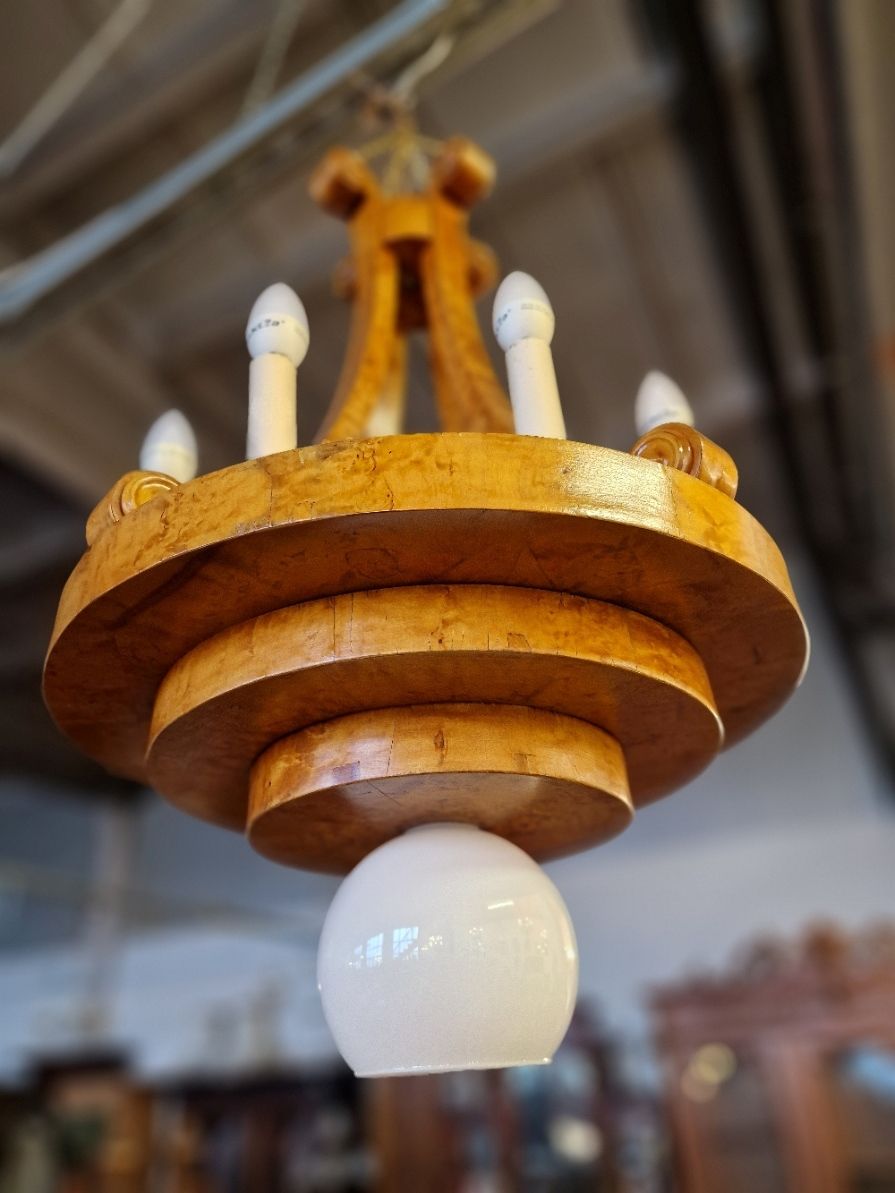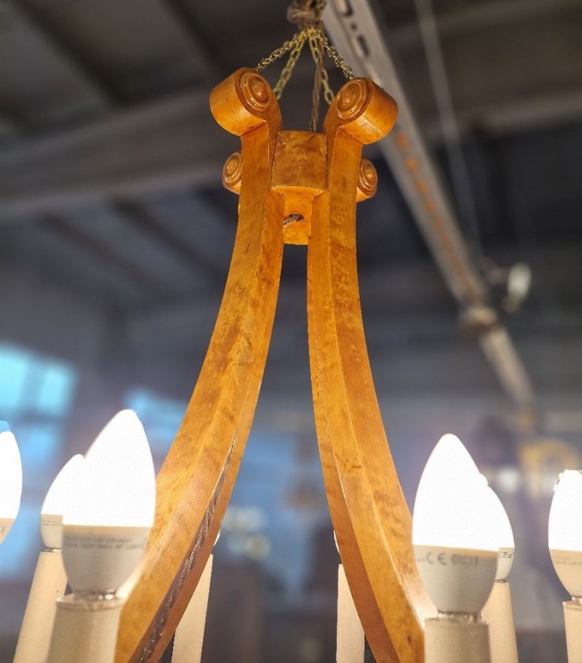 Very beautiful chandelier.Completely renovated.Made in Latvia in the 1920s.Pine, birch veneer.Height 90cm; diameter 49cm