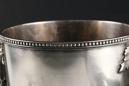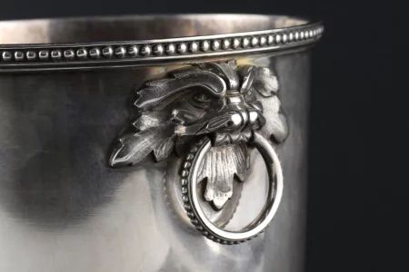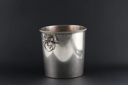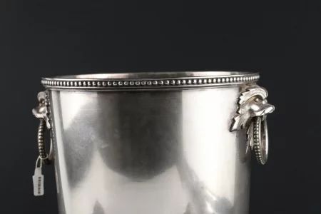 Wine cooler, decorated with handles in the shape of a lions head with rings and a pearl belt along the edge of the bucket and the middle of the rings. Brand of the manufacturer.