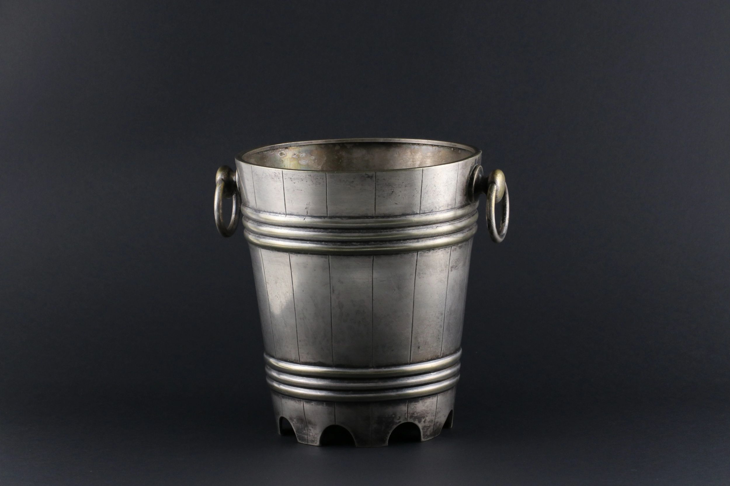 Винный кулер в форме деревянного ведра с кольцами на ручках и на аркочных проемах основания.Н-21 см.Посеребрение.Тулово охвачено двумя трехрядными поясами имитирующими стяжки лозы.