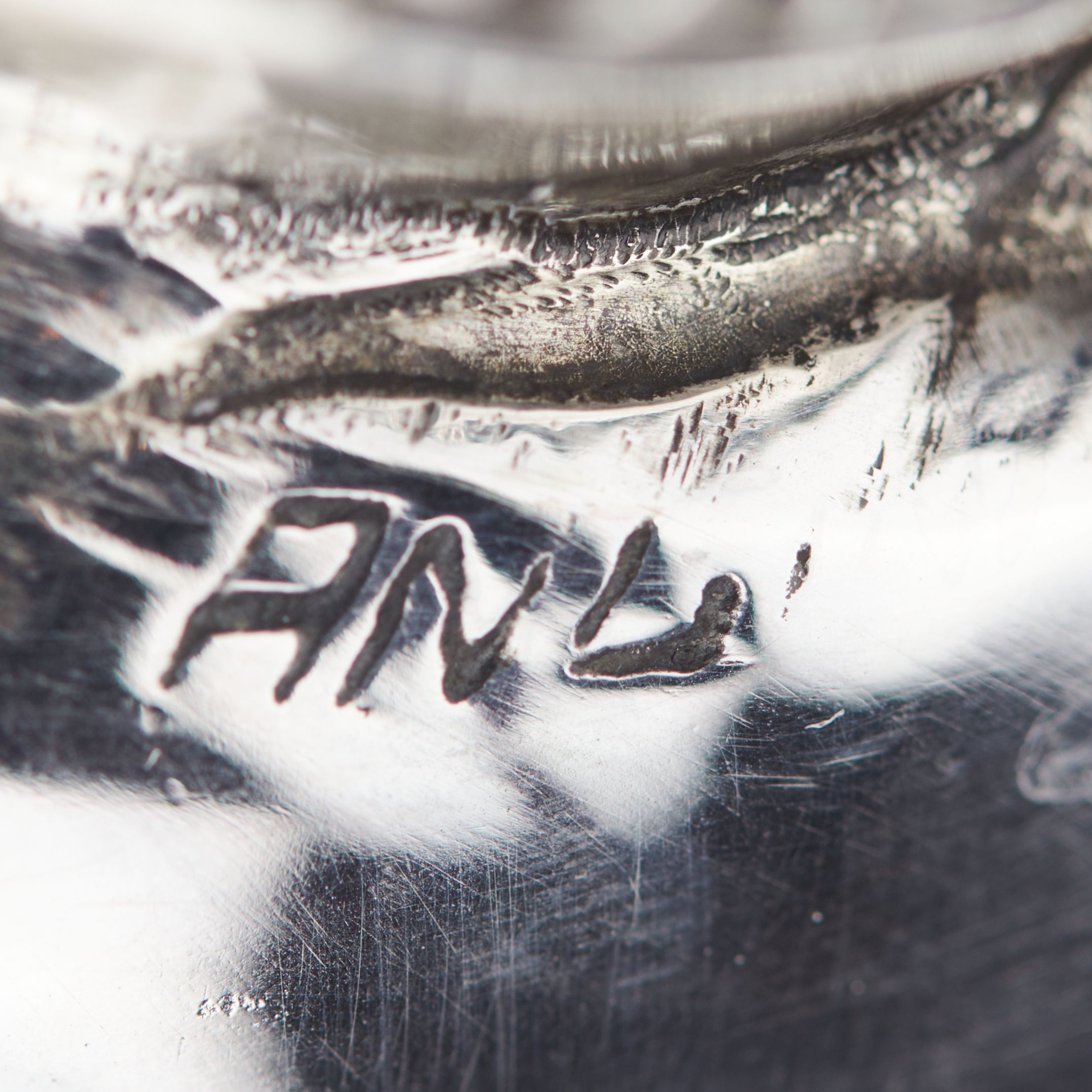 VENTE AUX ENCHÈRES D’ART RUSSE ET EUROPÉEN N° 15 · PARTIE IIExpressive figure de cabinet en argent représentant un clown, réalisée par l’atelier italien Ancini dans la seconde moitié du XXᵉ siècle. La sculpture représente un personnage comique vêtu d’un costume de cirque caractéristique avec pantalon court, veste ample et grand nœud papillon décoratif. La plastique de la figure traduit un geste scénique: le personnage se penche légèrement en avant, les bras écartés, tandis que le visage exprime une émotion comique exagérée, conférant à la composition dynamisme et caractère théâtral.