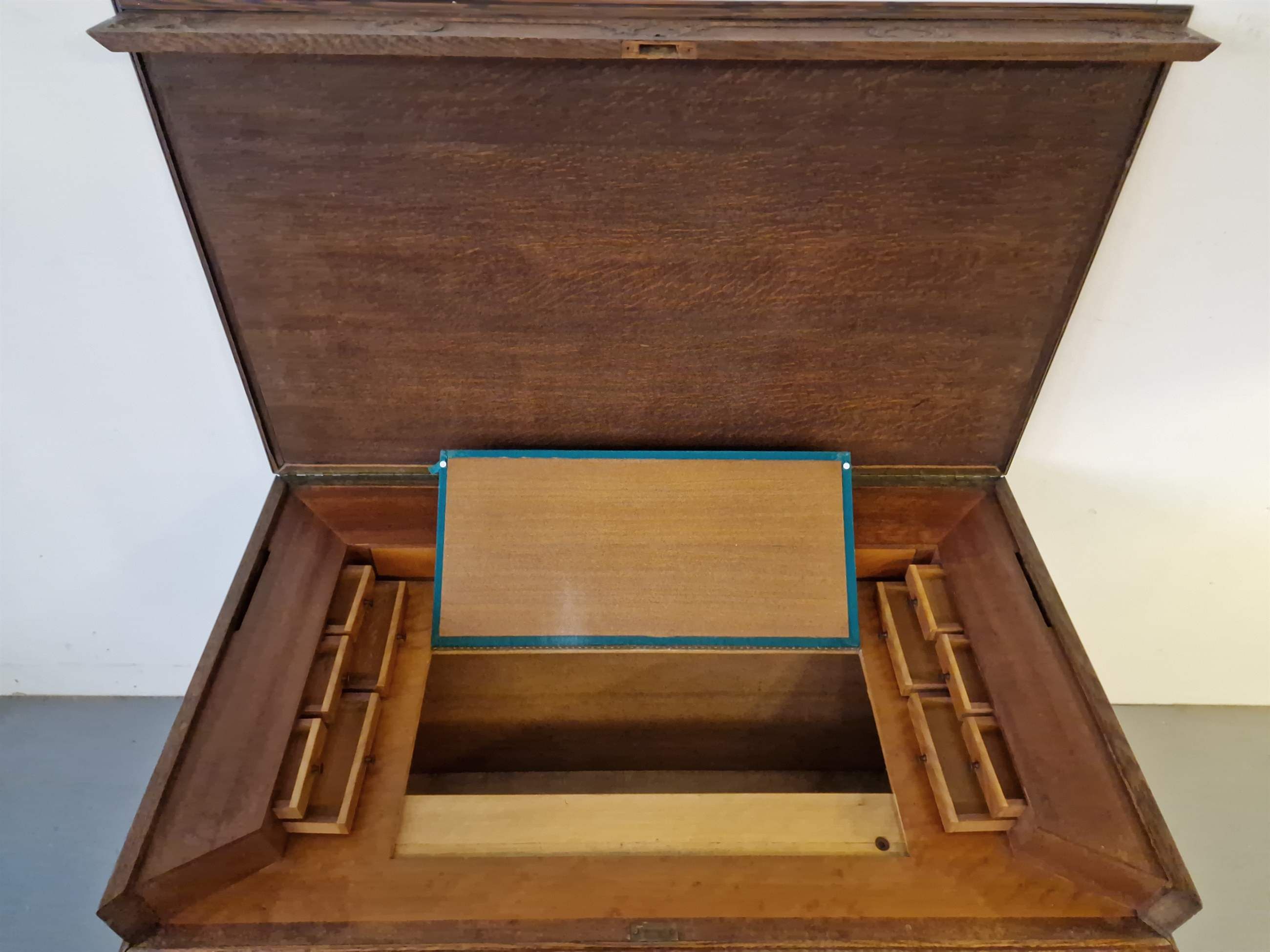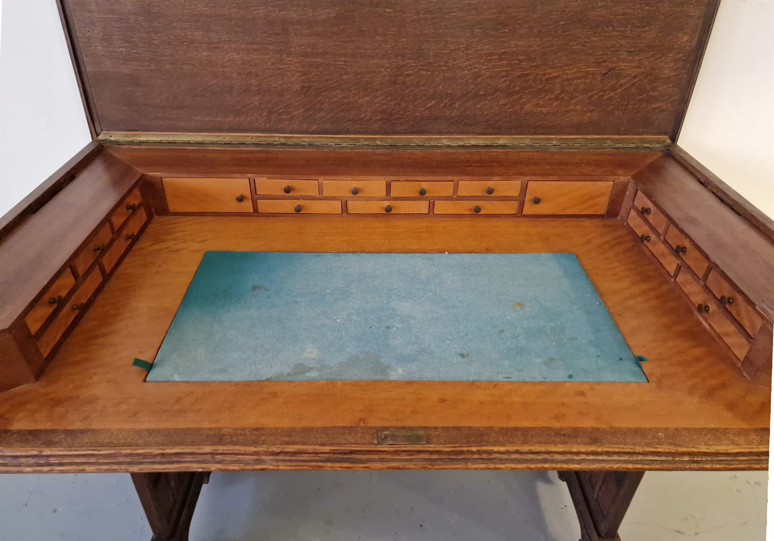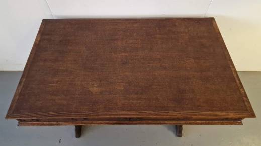 Bureau de style gothique. Chêne, acajou. France. Années 1910. Dimensions : hauteur 86 et 74 cm ; longueur 130 cm ; largeur 75 cm.