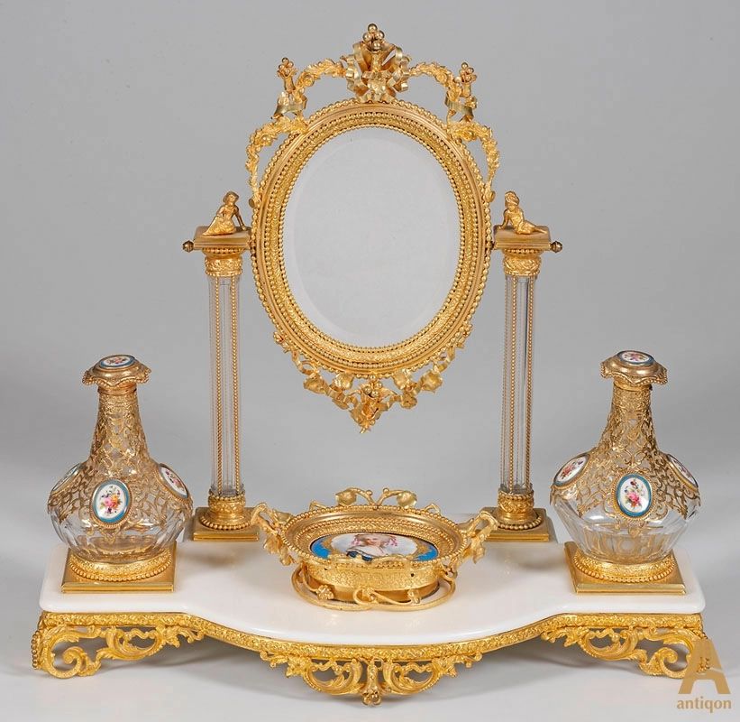 Elegant dressing table set, consisting of mirrors, perfume bottles and vases for storing jewelry, decorated with porcelain inserts.