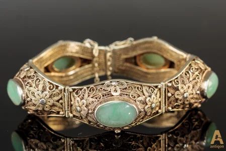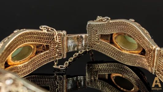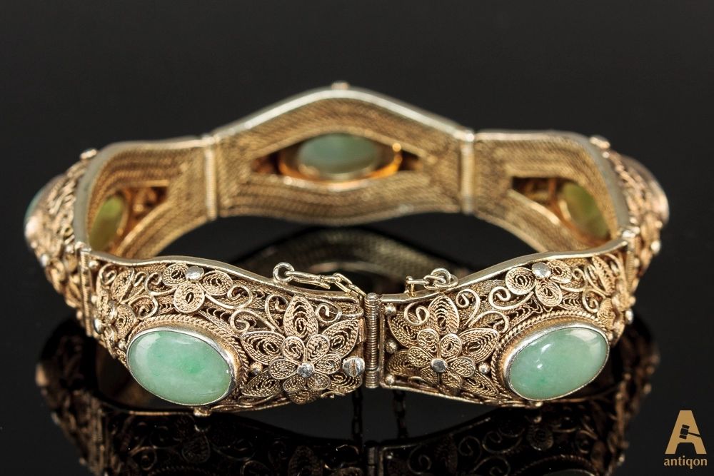 Silver bracelet made in the technique of filigree, decorated with semi-precious stones - jades. Total weight 43 gr.