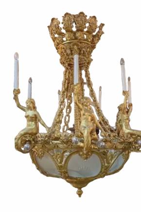 Un lustre en bronze dore à amphitrides pour 7 bougies du dernier quart du 19ème siècle.C`est une composition complexe avec des demi-figures de deesses de la mer, un dôme rocaille en verre depoli et un riche eventail de bronzes decoratifs en chaînes et un plafonnier. Des coquillages, des mascarons, des vignettes et des chaînes au profil complexe participent à la plasticite mobile du motif, creant un magnifique accord de lumière chatoyante et flamboyante. La mobilite, l`eau, l`air, le feu et les elements lumineux sont unis par la magie de l`Art nouveau primitif, encore incarne dans l`incroyable richesse des formes de l`epoque de Napoleon III. Hauteur 1,75 cm Largeur 1,20 cm.