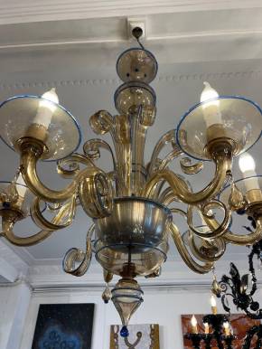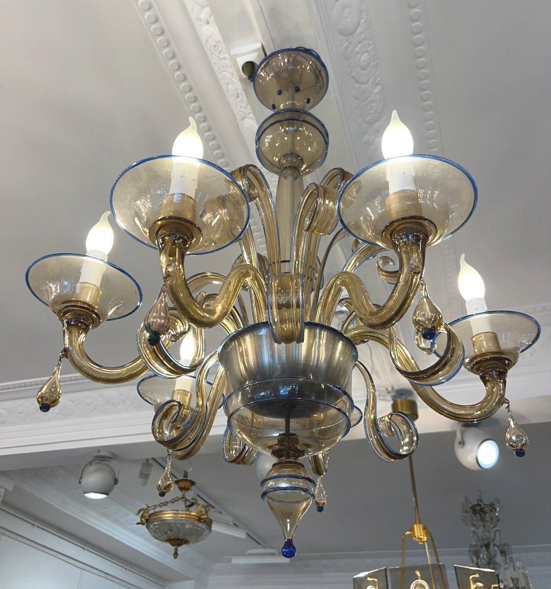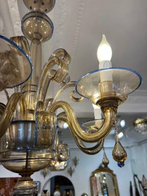 This exquisite six-light chandelier was crafted by the renowned Italian glassmaker Paolo Venini (1895– 1959) in Murano during the 1950s. The cups are accentuated with a delicate blue lattice design. The electrical system is in excellent condition.