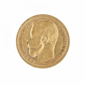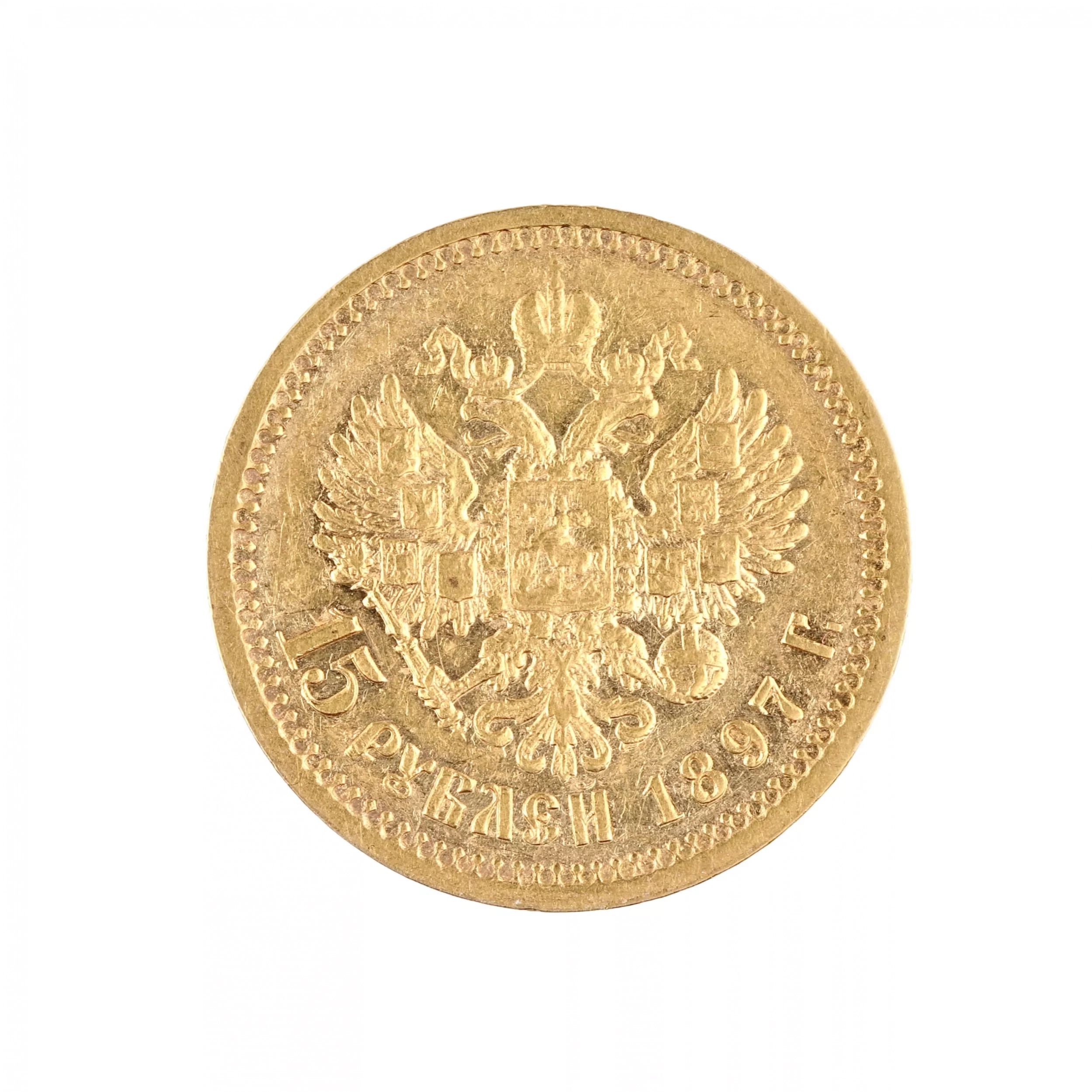 Pièce d`or russe 15 roubles 1897. Diamètre 24,5 mm. Poids 13 grammes.