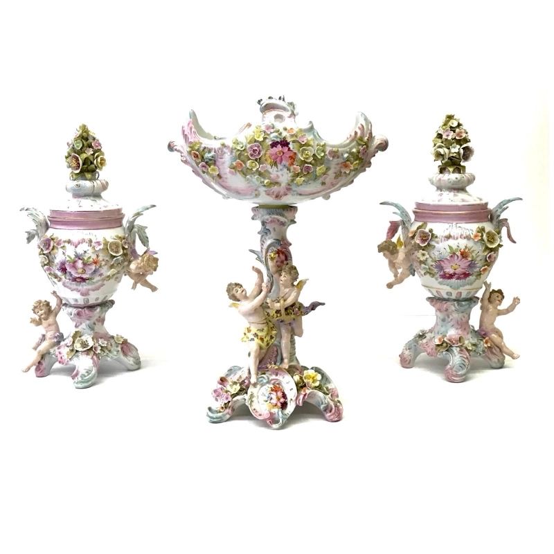 Porcelain composition consisting of two vases with flower caps and an elegant bowl on the leg.