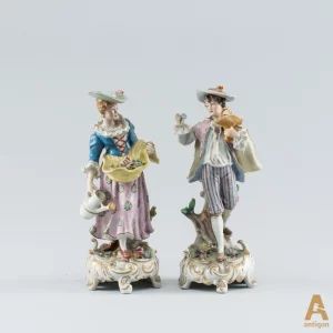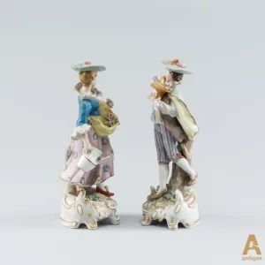 Porcelain group "Romantic couple" consisting of two figures, Girl with a watering can and Boy with a basket of flowers.
