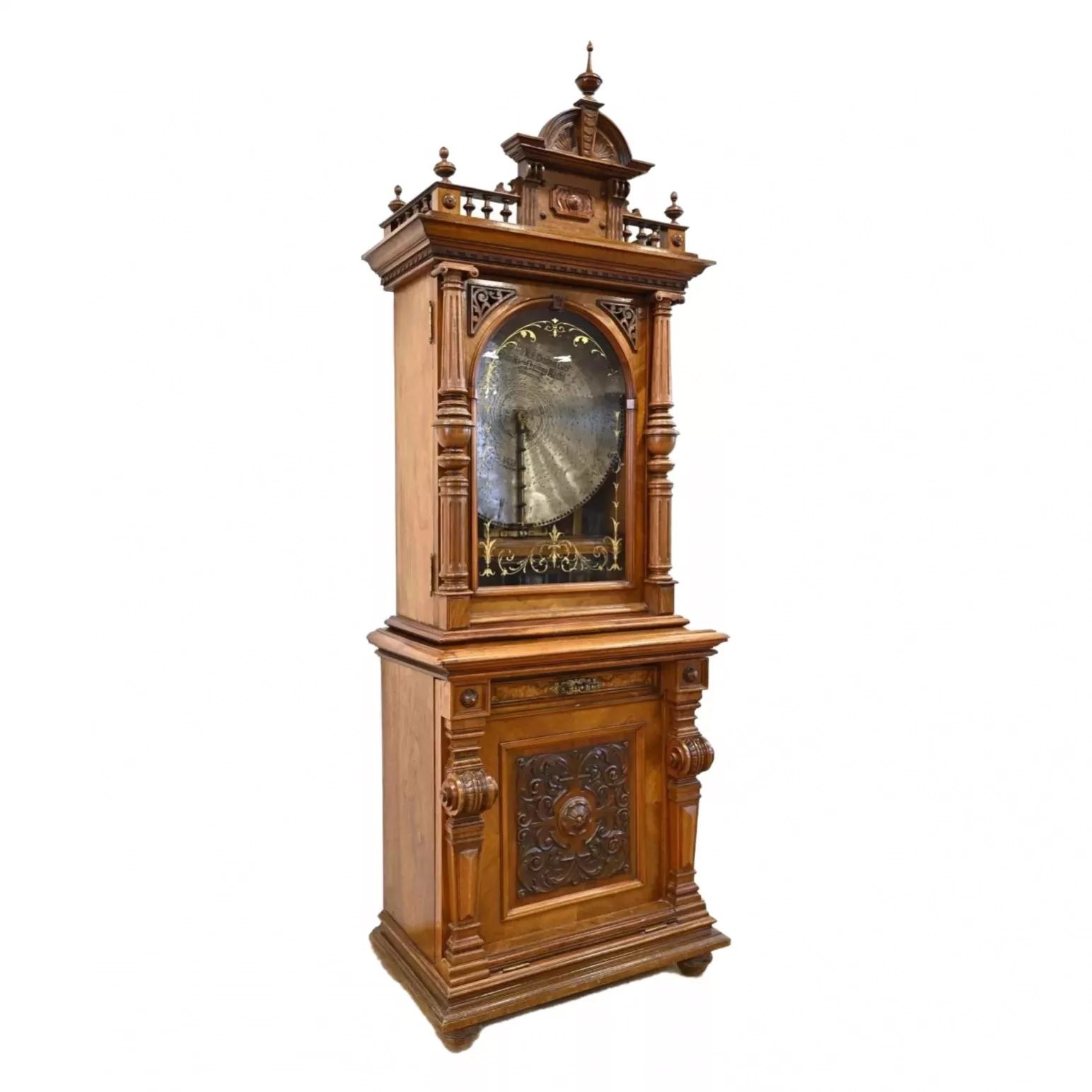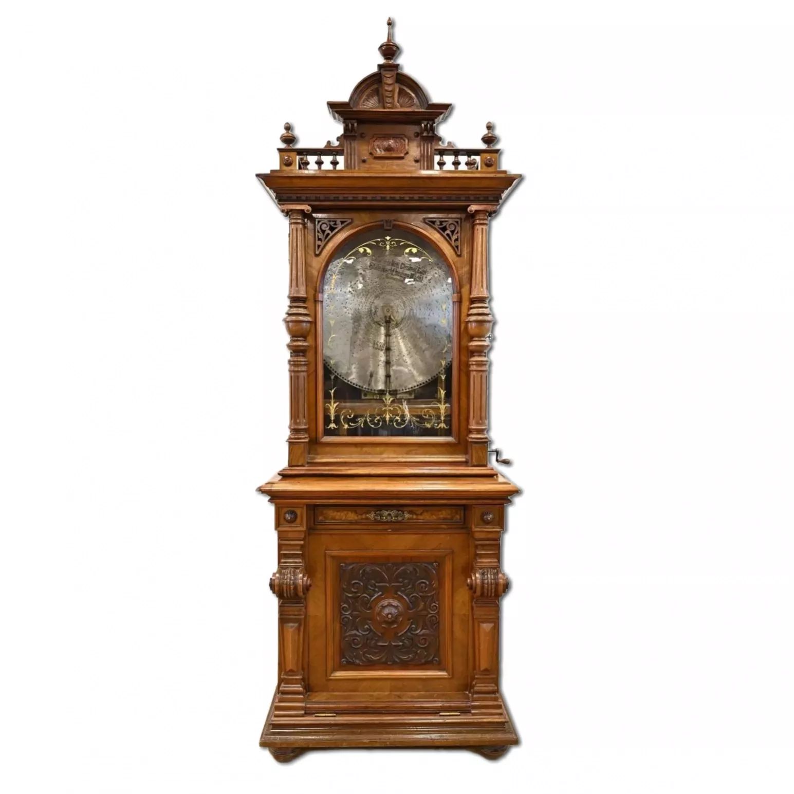 Meuble à musique Symphonion realise en placage de noyer massif à la manufacture de Leipzig vers 1890. Un appareil elegant avec un beau pommeau architectural et des balustres decoratifs. Une puissante frise à gradins en partie basse dans le style Neo-Renaissance. La partie inferieure contient plus de 20 disques perfores (diamètre 62 cm). Le ressort helicoïdal est enroule avec une manivelle. Le mecanisme automatique est active lorsqu`une pièce de 5 pfennigkopeck est inseree. Hauteur 247 x 88 x 52 cm Le mecanisme est entièrement fonctionnel, le boitier est en bon etat avec des traces d`usure.