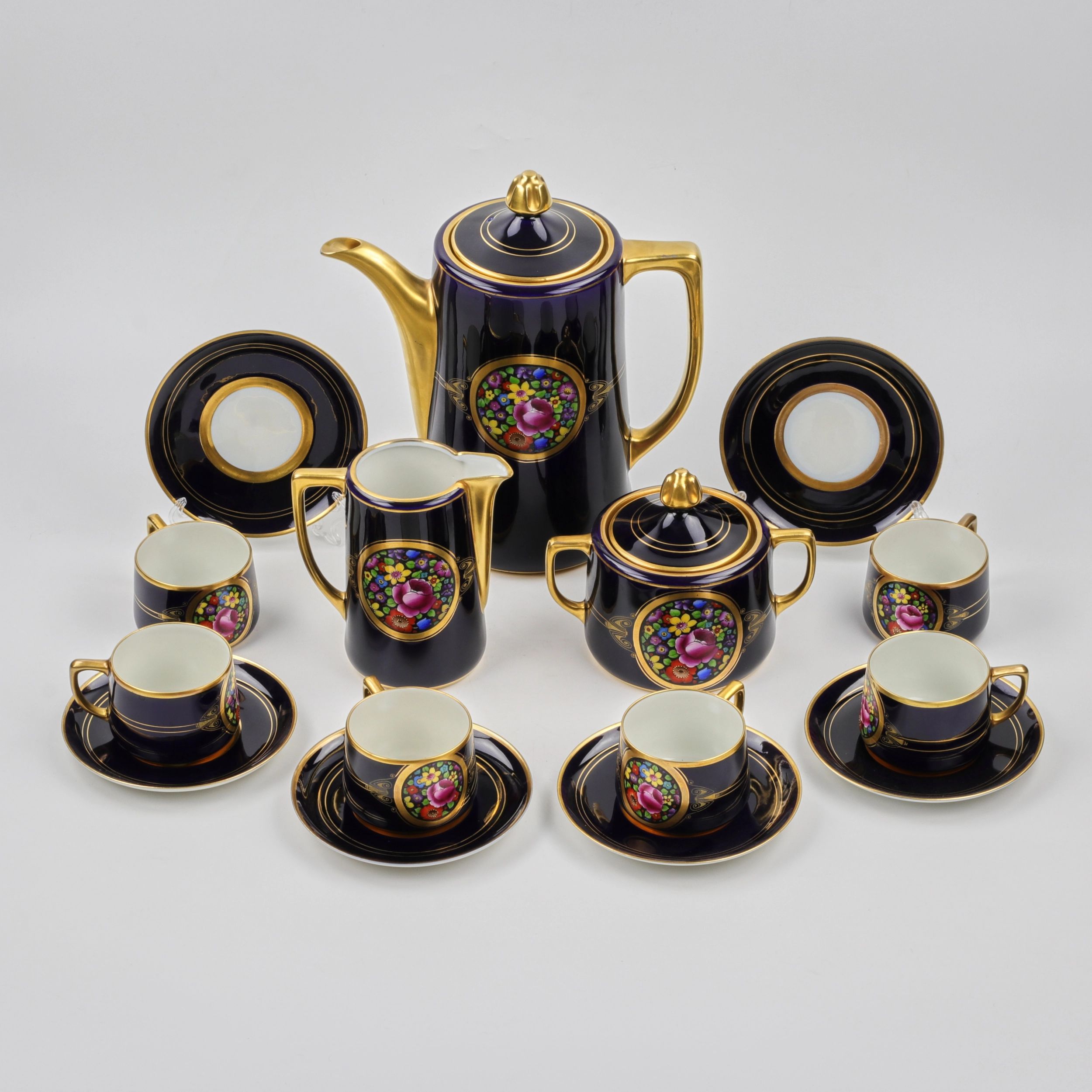 Service à cafe de 15 pièces, ornements de peinture polychrome realises en Jugendstil sur fond de cobalt. 1910 g.
