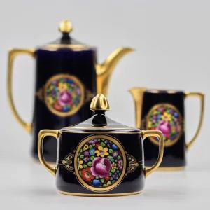 Кофейный сервиз из 15 предметов, украшений полихромную росписью выполненный в Jugendstil по кобальтовому фону. 1910 г .