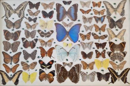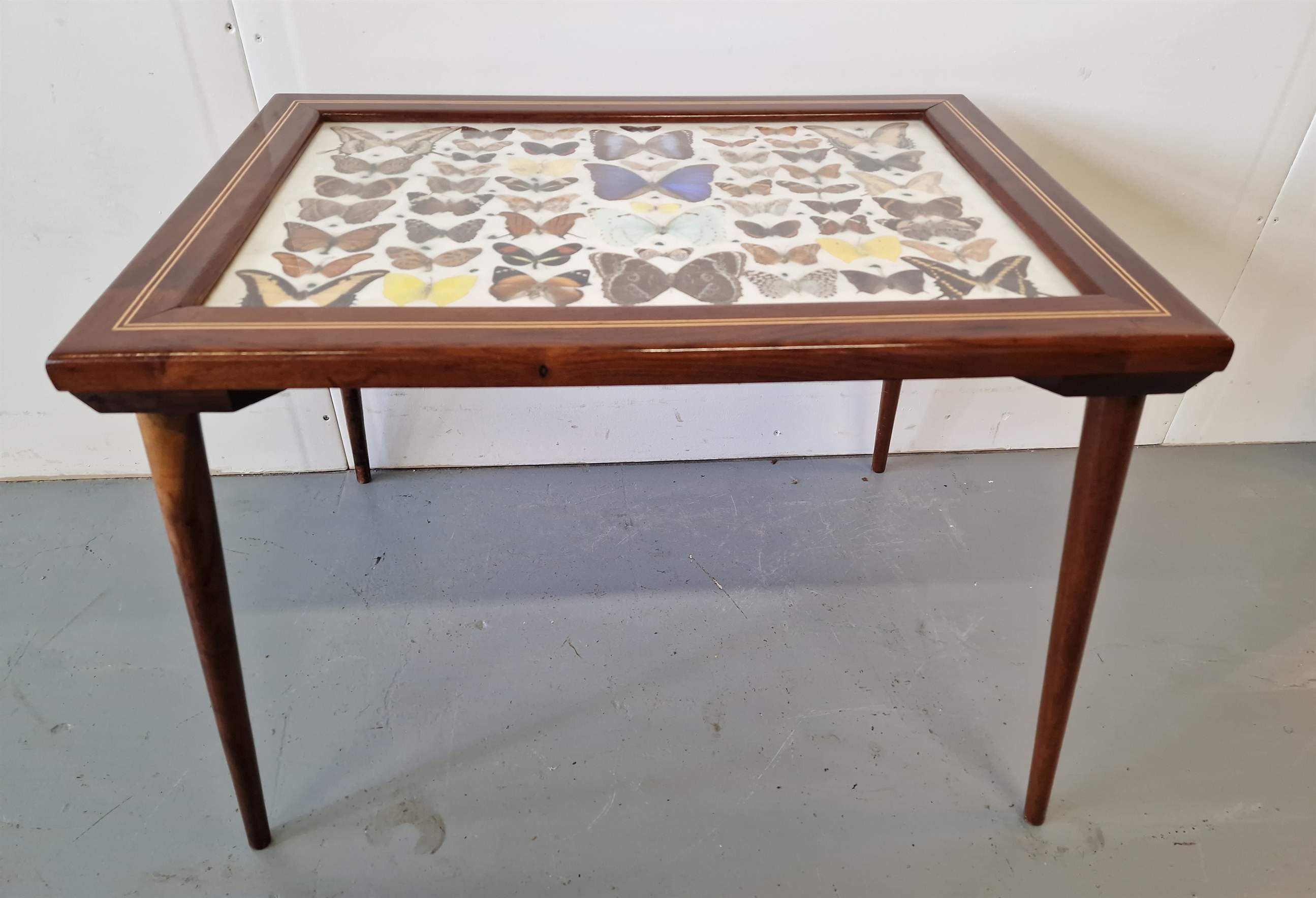 Table vintage avec papillons. Brésil. Années 1960. Bois exotique, marqueterie, papillons de différentes essences. Dimensions : hauteur 52 cm ; longueur 71 cm ; largeur 51 cm.