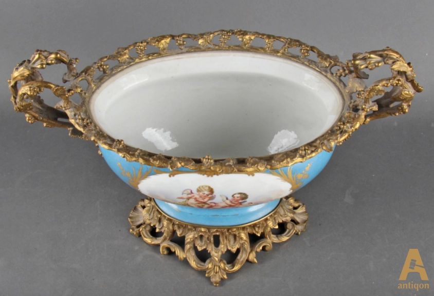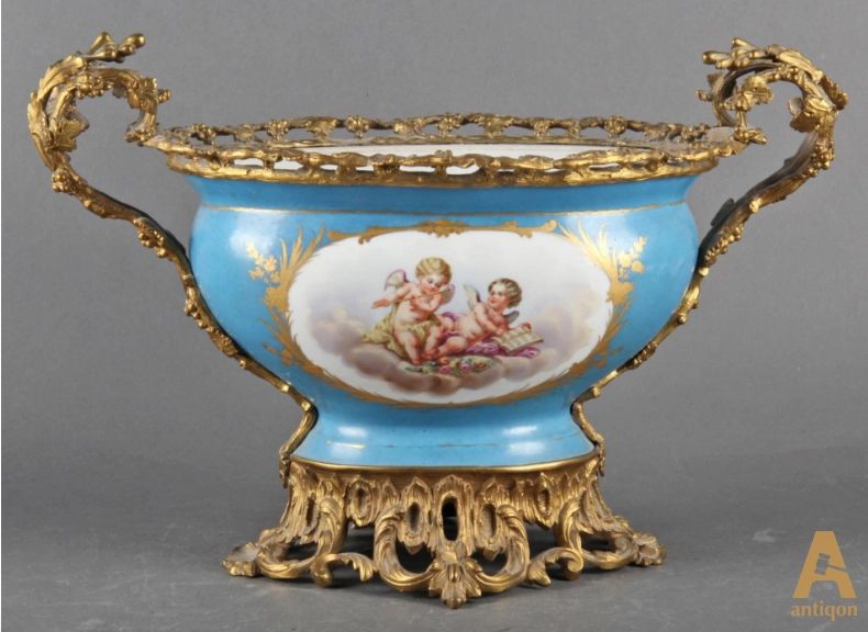 The jardiniere in Sevres style, decorated with decorative elements of artistic bronze as well as drawings in the form of playing angels and flowers.