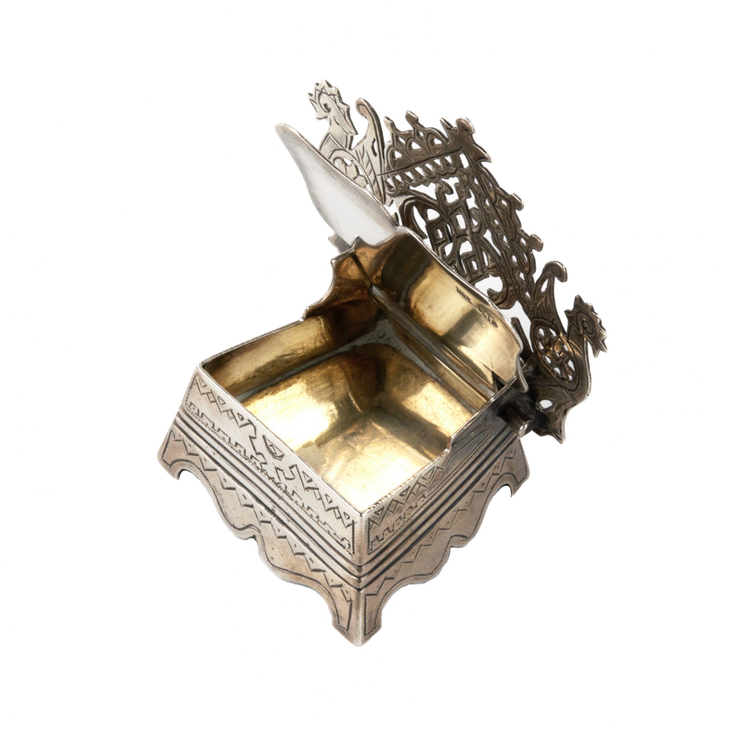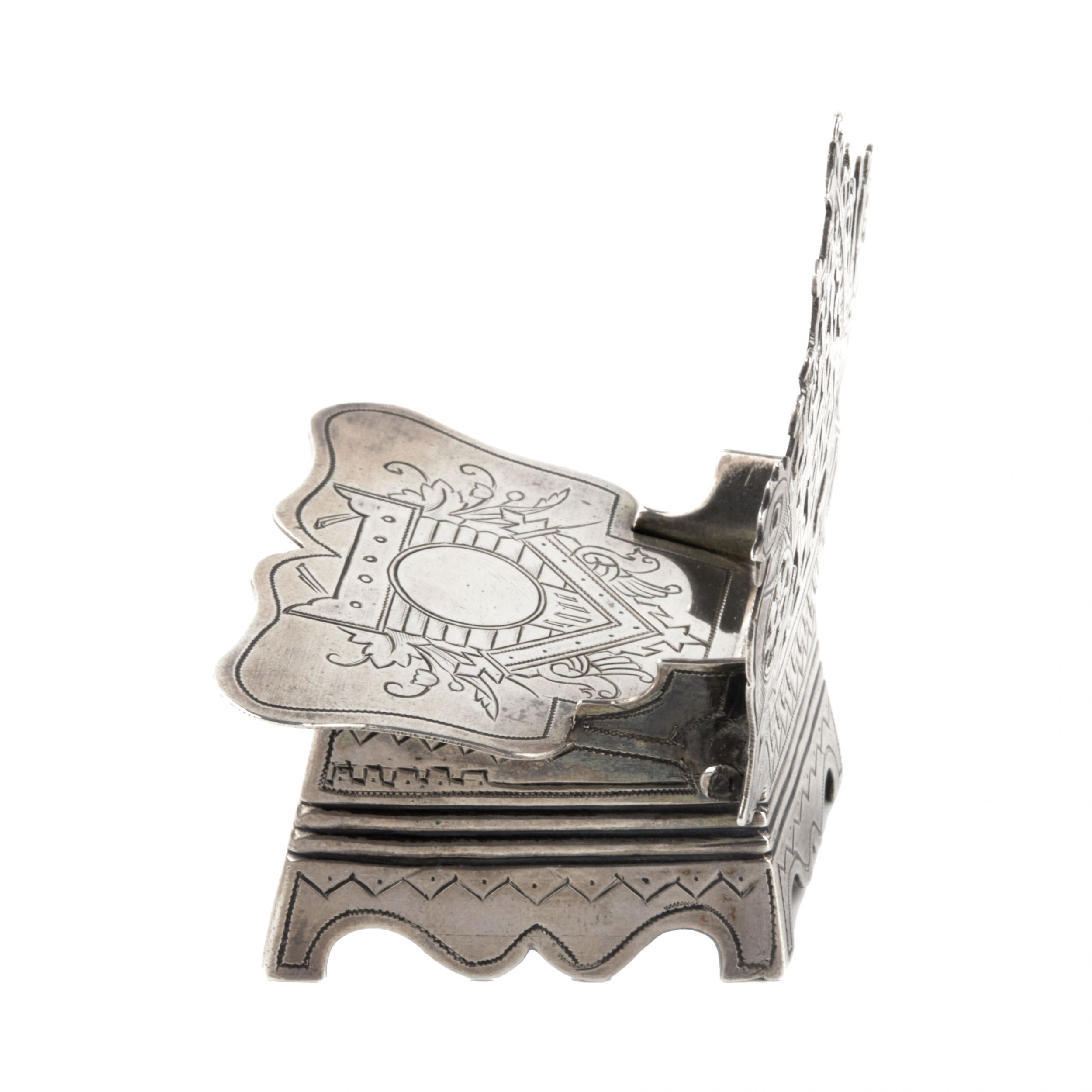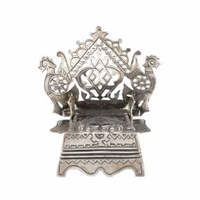 Trône de salière miniature russe en argent, avec un charmant dos sculpte et une maison gravee sur le siège. Imite l`artisanat fait de bois et d`ecorce de bouleau. Beau travail soigne et proportionne. Dosage d`argent de Moscou 84, 1888. Maître d`essai A.A: Artsibashev Anatoly Apollonovich. Maître MG: Goloschanov Mikhail, connu comme l`orfèvre de 1883-1912.