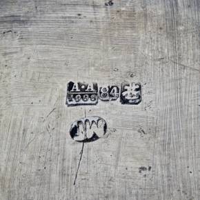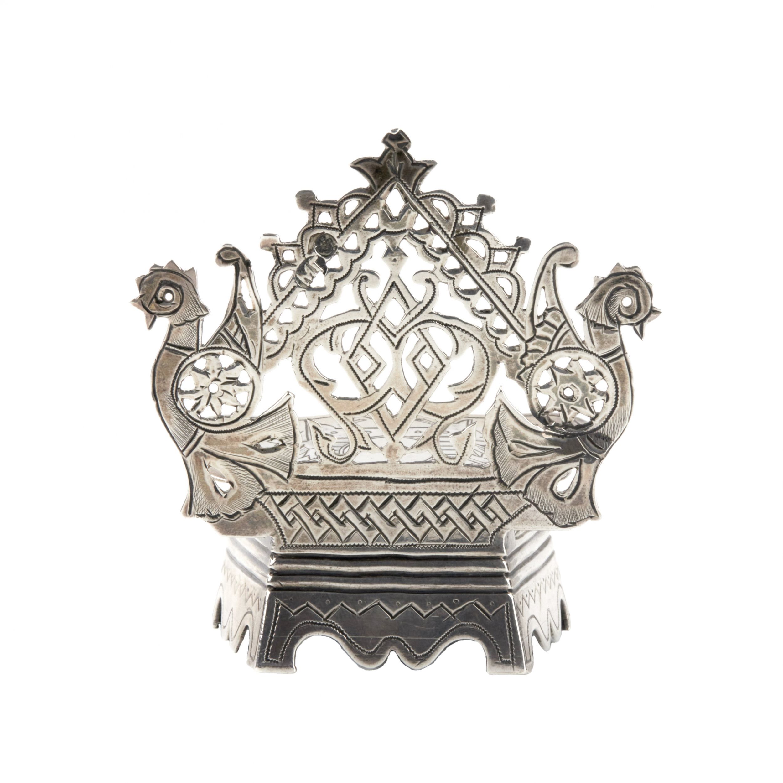 Миниатюрная, русская, серебряная солонка-трон, с обворожительной резной спинкой и гравированным домиком на сиденье. Подражает деревянным и берестяным изделиям промыслов. Милая аккуратная и пропорциональная работа. Московская 84 проба серебра 1888 года. Пробирный мастер А.А: Арцибашев Анатолий Аполлонович. Мастер МГ: Голощанов Михаил, известный как серебряных дел мастер 1883-1912 годов.