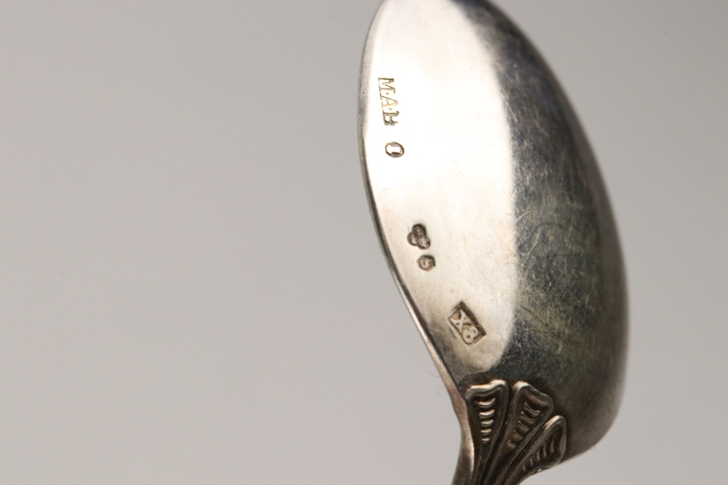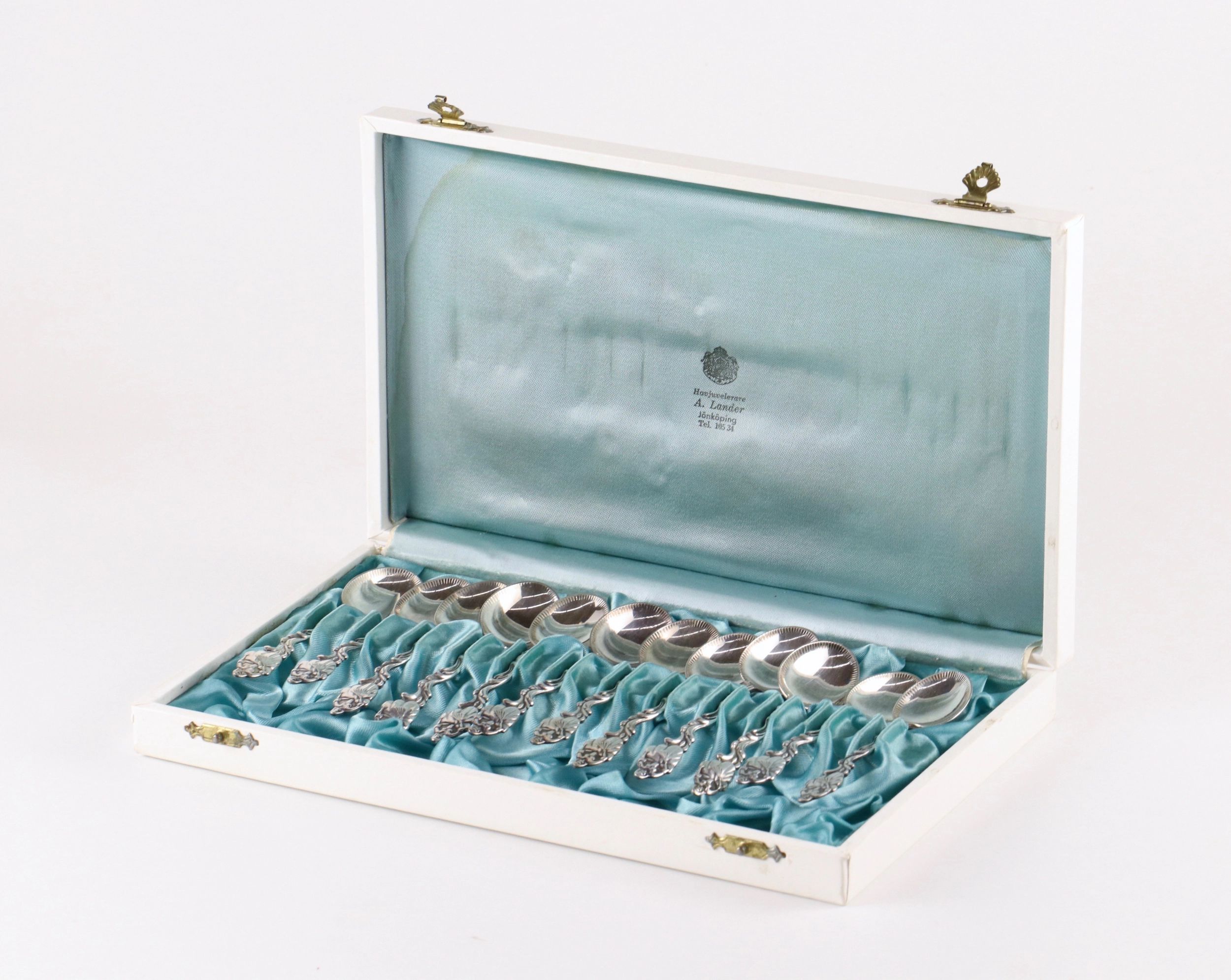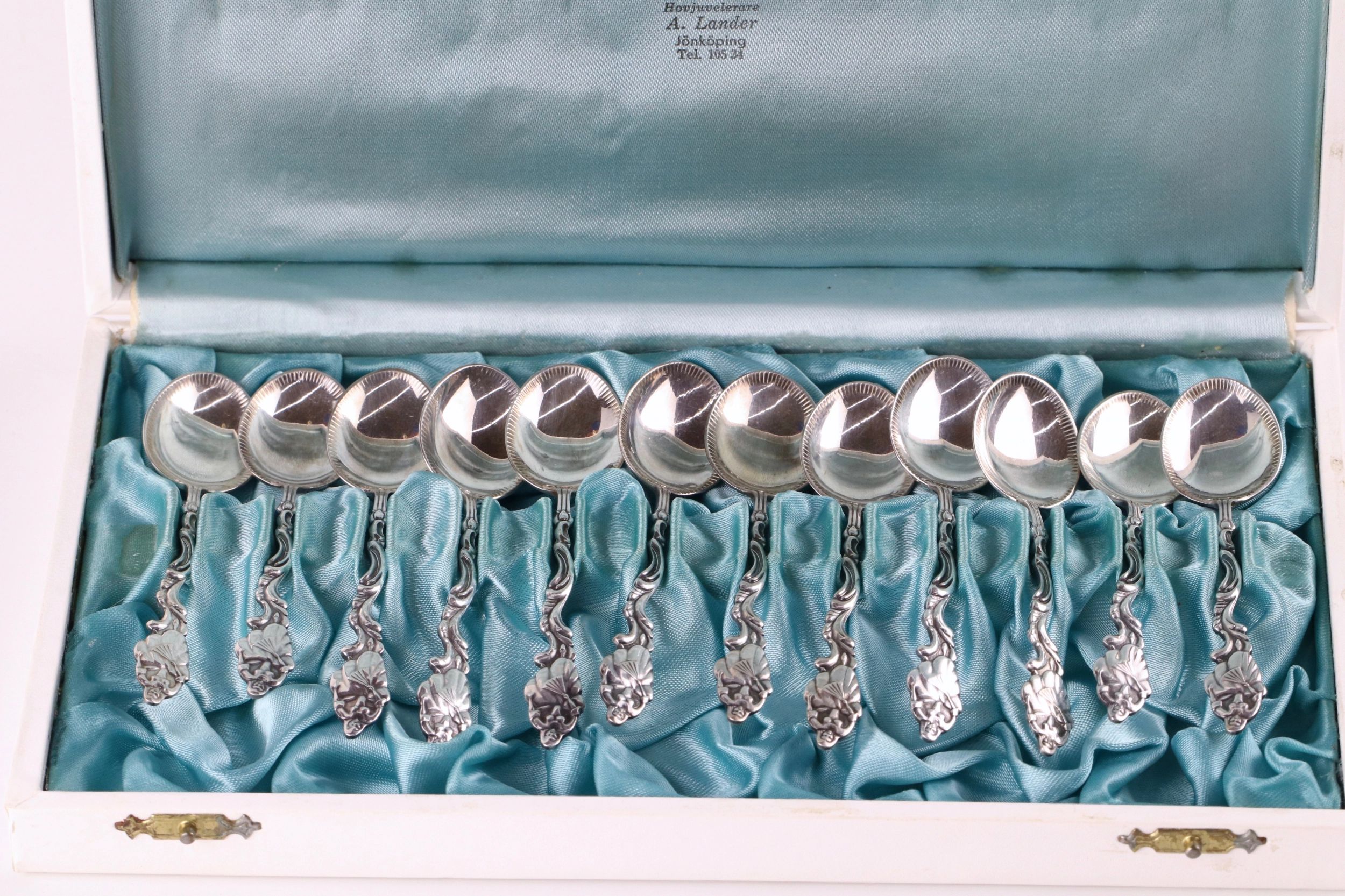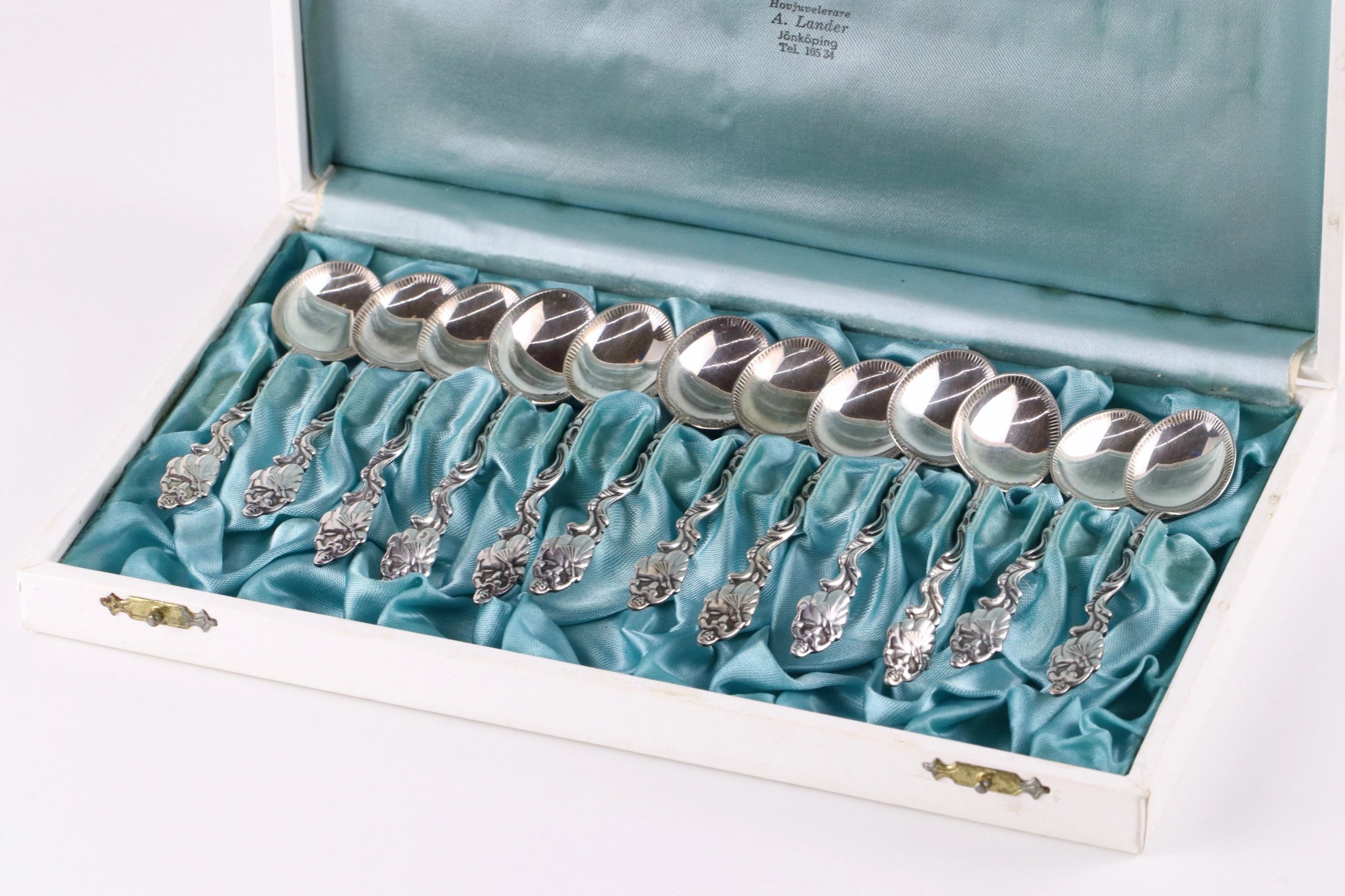 Un ensemble de cuillères à cafe en argent dans une boîte dorigine. Avec une poignee ondulee et une fleur en forme de poignee. Ensemble complet, 12 pièces