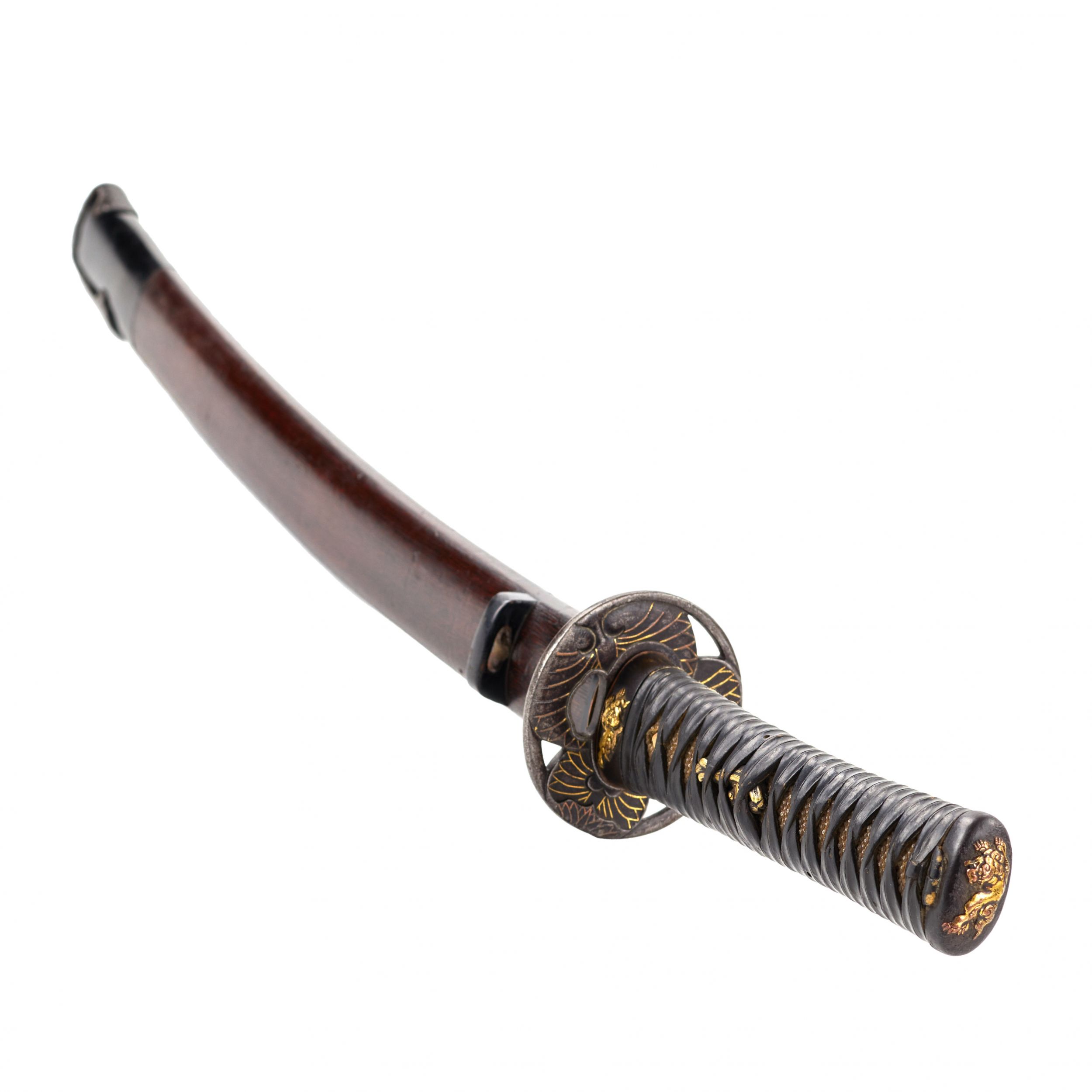 Japāņu zobens. Vakizaši. 19. gadsimts. Tērauda asmens. Koka, reljefā ādā, apvalks ar bronzas aizbīdni, kas rotāts ar zirgiem. Ādas pīts rokturis, dzeloņraju āda, ar bronzas figūriņām. Roktura galā ir tīģera figūriņa. Welt aizsargs (tsuba) ar ziediem. Garums: 71 cm.Nezināms meistars.
