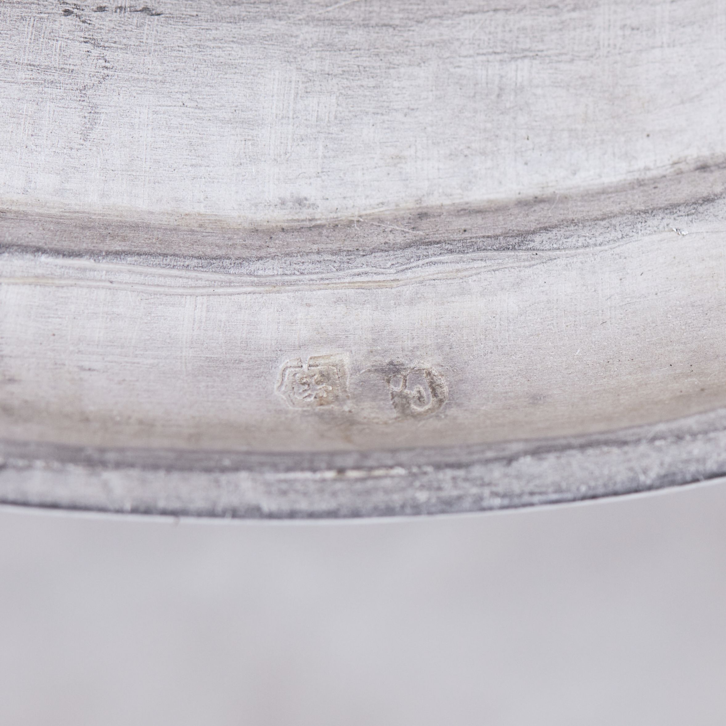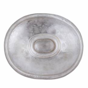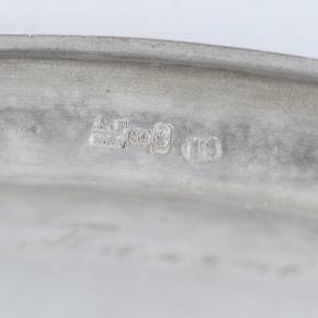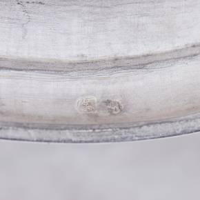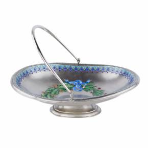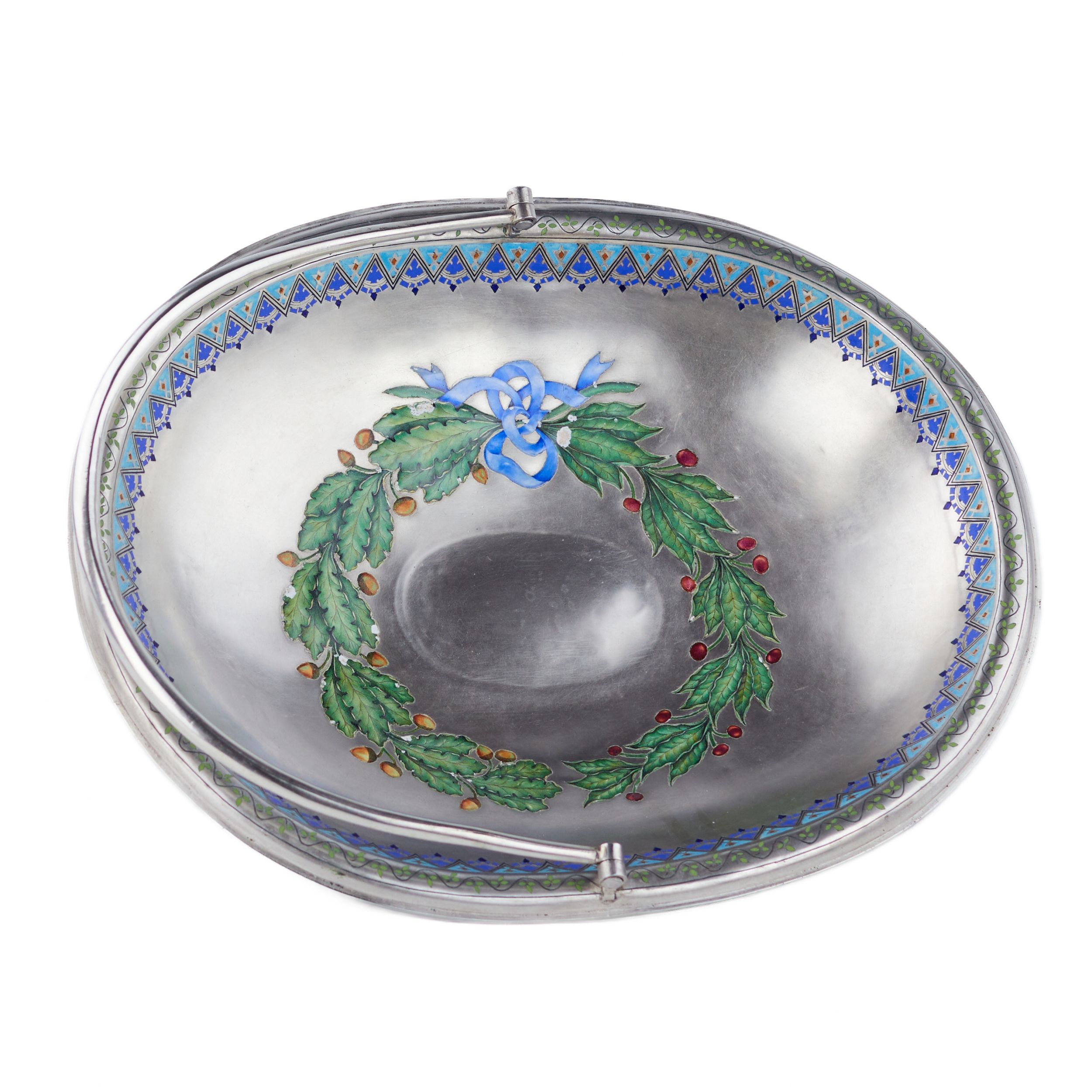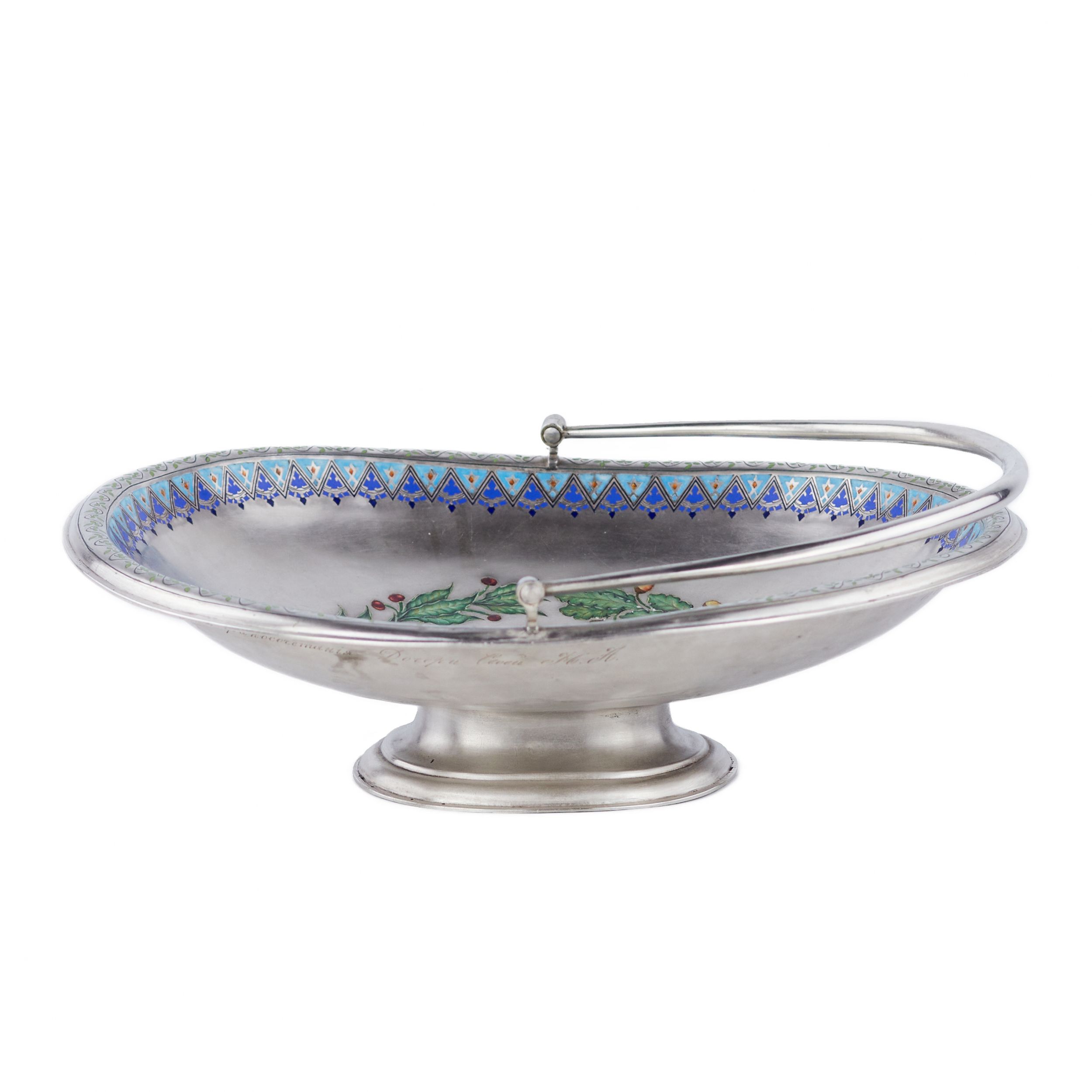 Elegants sudraba konfekšu trauciņš uz apaļas pamatnes ar pārvietojamu, noapaļota šķērsgriezuma rokturi. Iekšpusi rotā apgleznots ozola un lauru lapu vainags, kas savīts ar zilu lent
