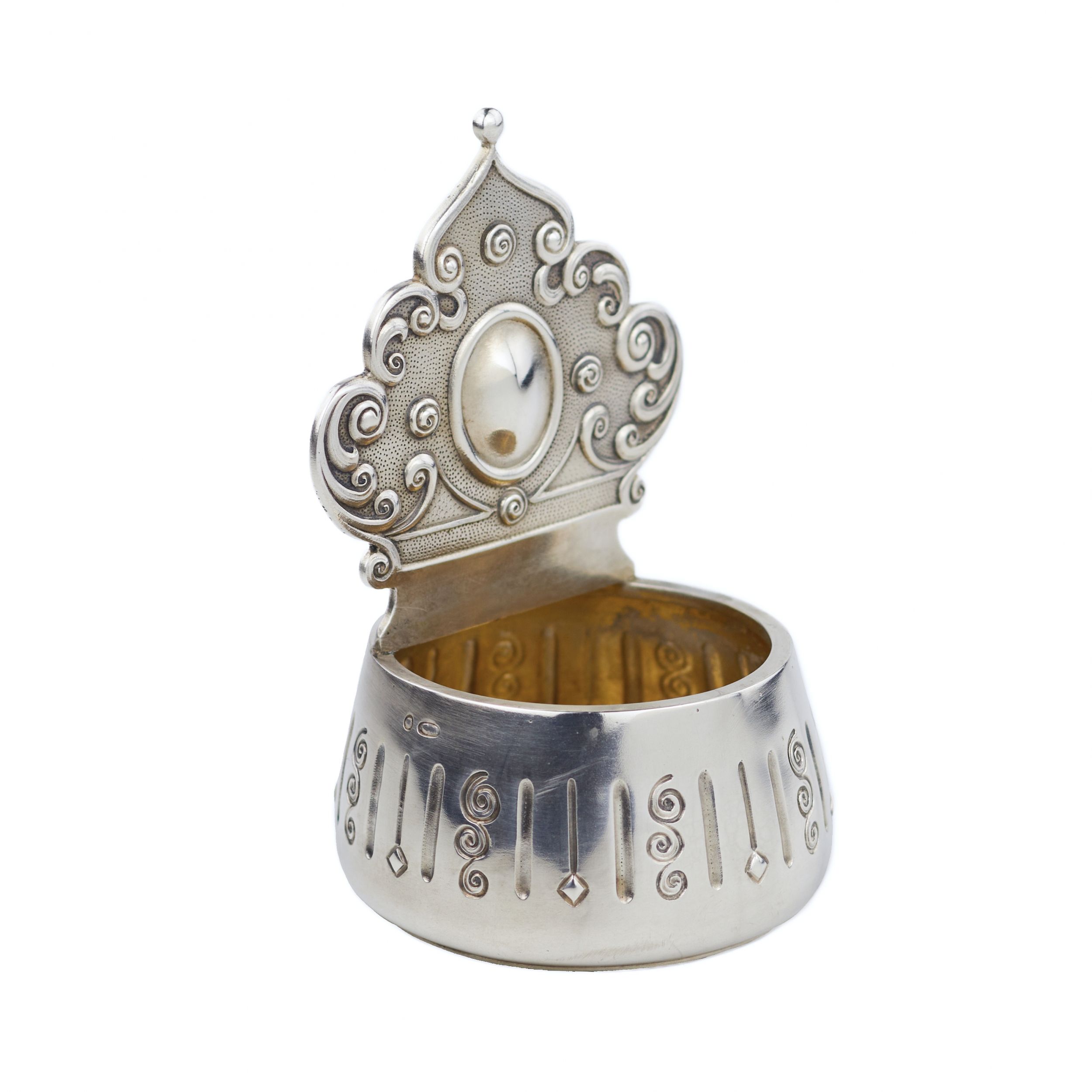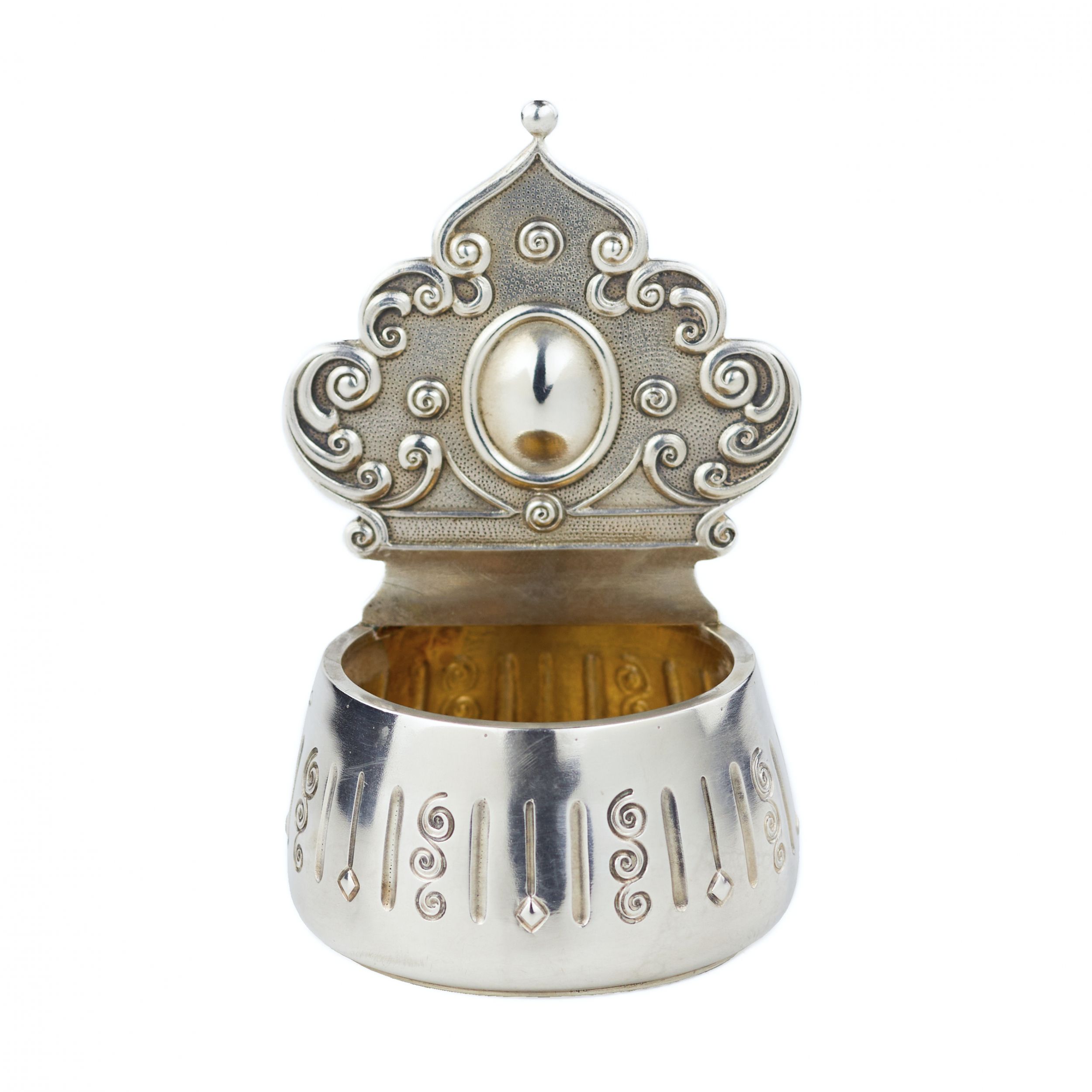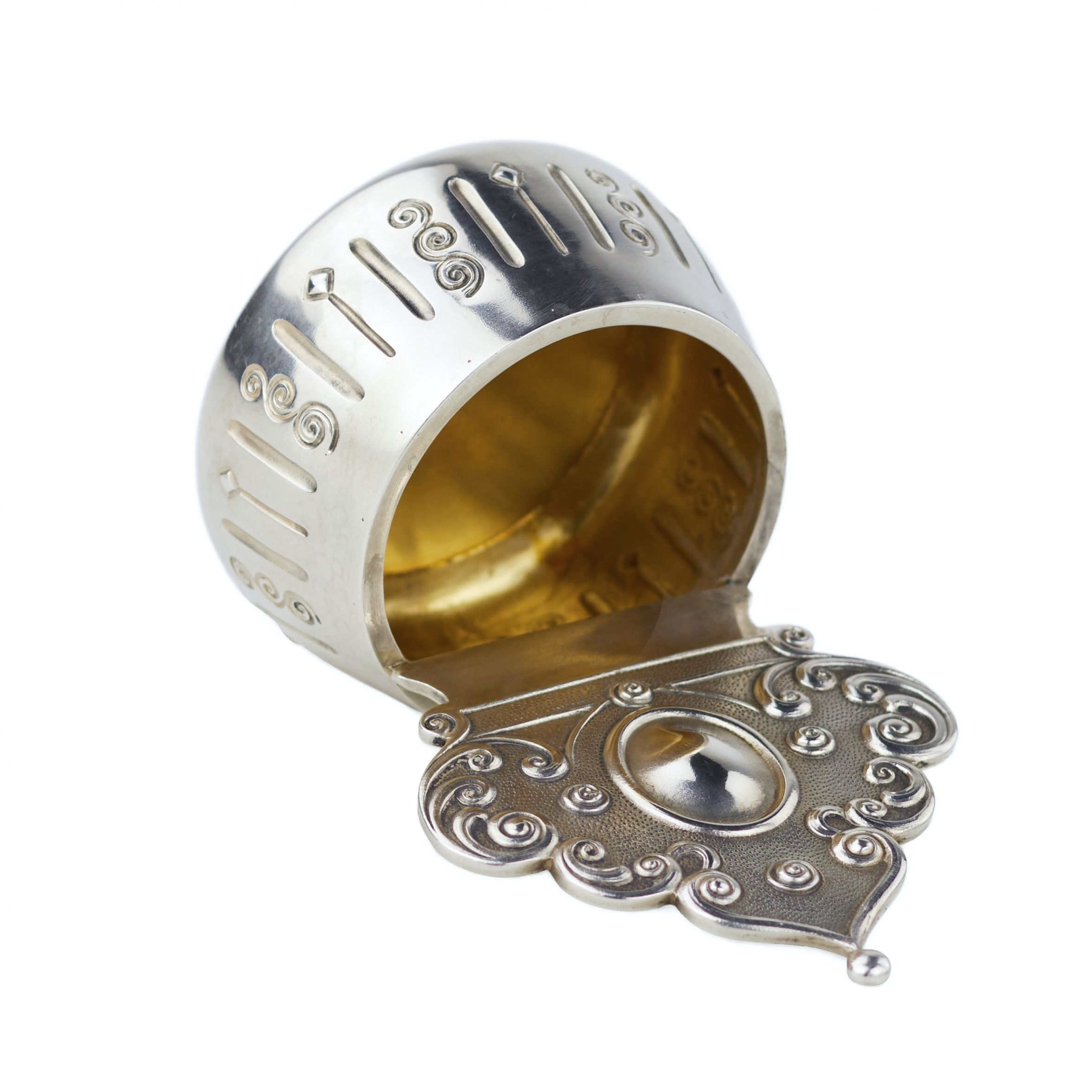 KRIEVU UN EIROPAS MĀKSLAS IZSOLE NR. 13Liels sudraba kovšs, kas darināts izteiksmīgā krievu jūgendstila stilā ar laikmetam raksturīgajām plūstošajām līnijām un dekoratīvu sarežģīta silueta rokturi. Korpusa asimetriskā forma, izteiksmīgais sānu izliekums un roktura atvērtās locītavas uzsver izstrādājuma piederību 19. gadsimta beigu un 20. gadsimta sākuma augsti mākslinieciskajai rotaslietai. Iekšpuse ir dekorēta ar oriģinālu zeltījumu, kas pastiprina dekoratīvo efektu un piešķir kovšam svinīgu, svinīgu raksturu. Augstā, ažūra aizmugure ir veidota kā stilizēts kokošņiks ar reljefu ziedu rakstu un gludu centrālo medaljonu, kas paredzēts gravēšanai. Korpuss ir dekorēts ar pagarinātām šuvēm un lokām nacionālā romantisma stila garā, apvienojot senās krievu formas ar jūgendstila estētiku.