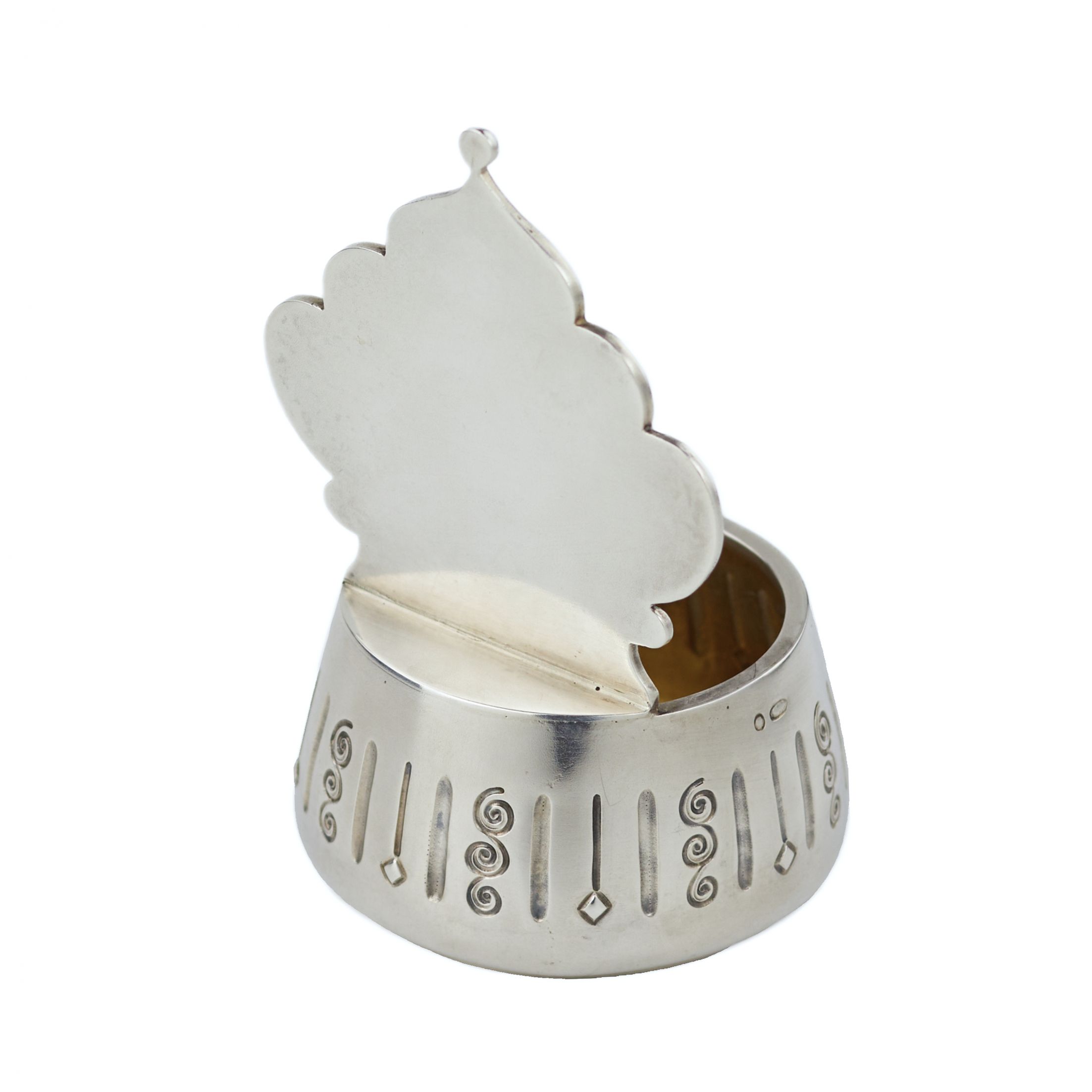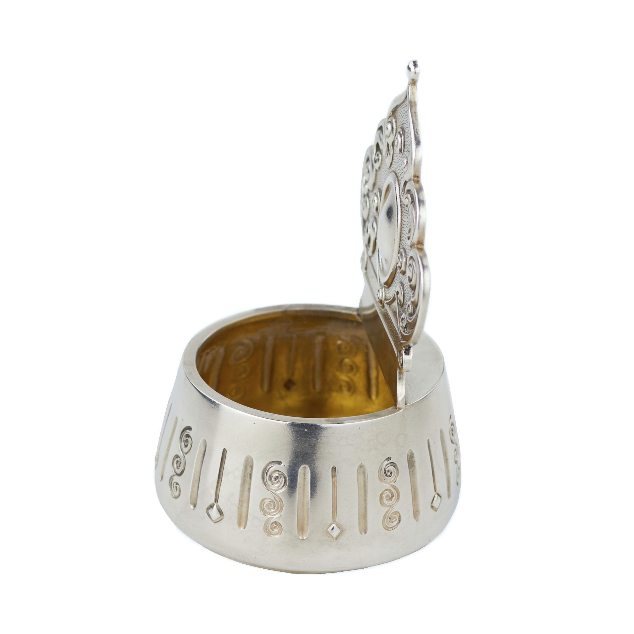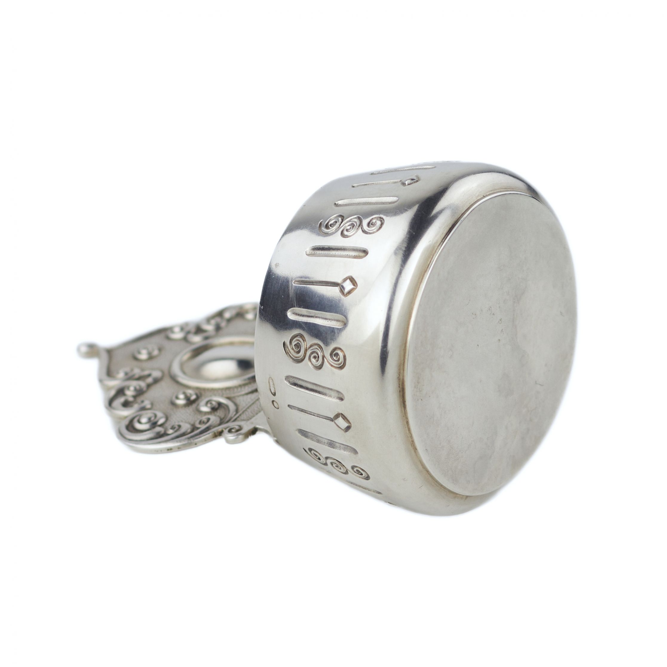 KRIEVU UN EIROPAS MĀKSLAS IZSOLE NR. 13Liels sudraba kovšs, kas darināts izteiksmīgā krievu jūgendstila stilā ar laikmetam raksturīgajām plūstošajām līnijām un dekoratīvu sarežģīta silueta rokturi. Korpusa asimetriskā forma, izteiksmīgais sānu izliekums un roktura atvērtās locītavas uzsver izstrādājuma piederību 19. gadsimta beigu un 20. gadsimta sākuma augsti mākslinieciskajai rotaslietai. Iekšpuse ir dekorēta ar oriģinālu zeltījumu, kas pastiprina dekoratīvo efektu un piešķir kovšam svinīgu, svinīgu raksturu. Augstā, ažūra aizmugure ir veidota kā stilizēts kokošņiks ar reljefu ziedu rakstu un gludu centrālo medaljonu, kas paredzēts gravēšanai. Korpuss ir dekorēts ar pagarinātām šuvēm un lokām nacionālā romantisma stila garā, apvienojot senās krievu formas ar jūgendstila estētiku.