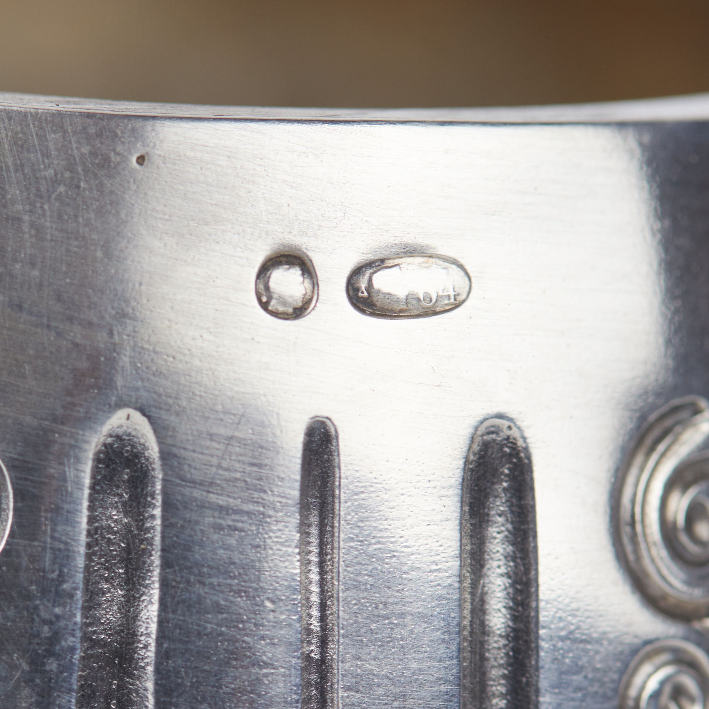 Крупный серебряный ковш, выполненный в выразительном стиле русского модерна, с характерной для эпохи пластикой линий и декоративной ручкой сложного силуэта. Ассиметричная форма корпуса, выразительный изгиб стенок и открытые соединения ручки подчёркивают принадлежность изделия к высокохудожественной ювелирной пластике конца XIX – начала XX века. Внутренняя поверхность украшена оригинальной позолотой, подчёркивающей декоративность и придающей ковшу парадный, праздничный характер. Высокая ажурная спинка оформлена в виде стилизованного кокошника с рельефным растительным орнаментом и гладким центральным медальоном, предназначенным для гравировки. Корпус украшен вытянутыми штихами и завитками в духе национально-романтического стиля, соединяющего древнерусские формы и эстетику модерна.
