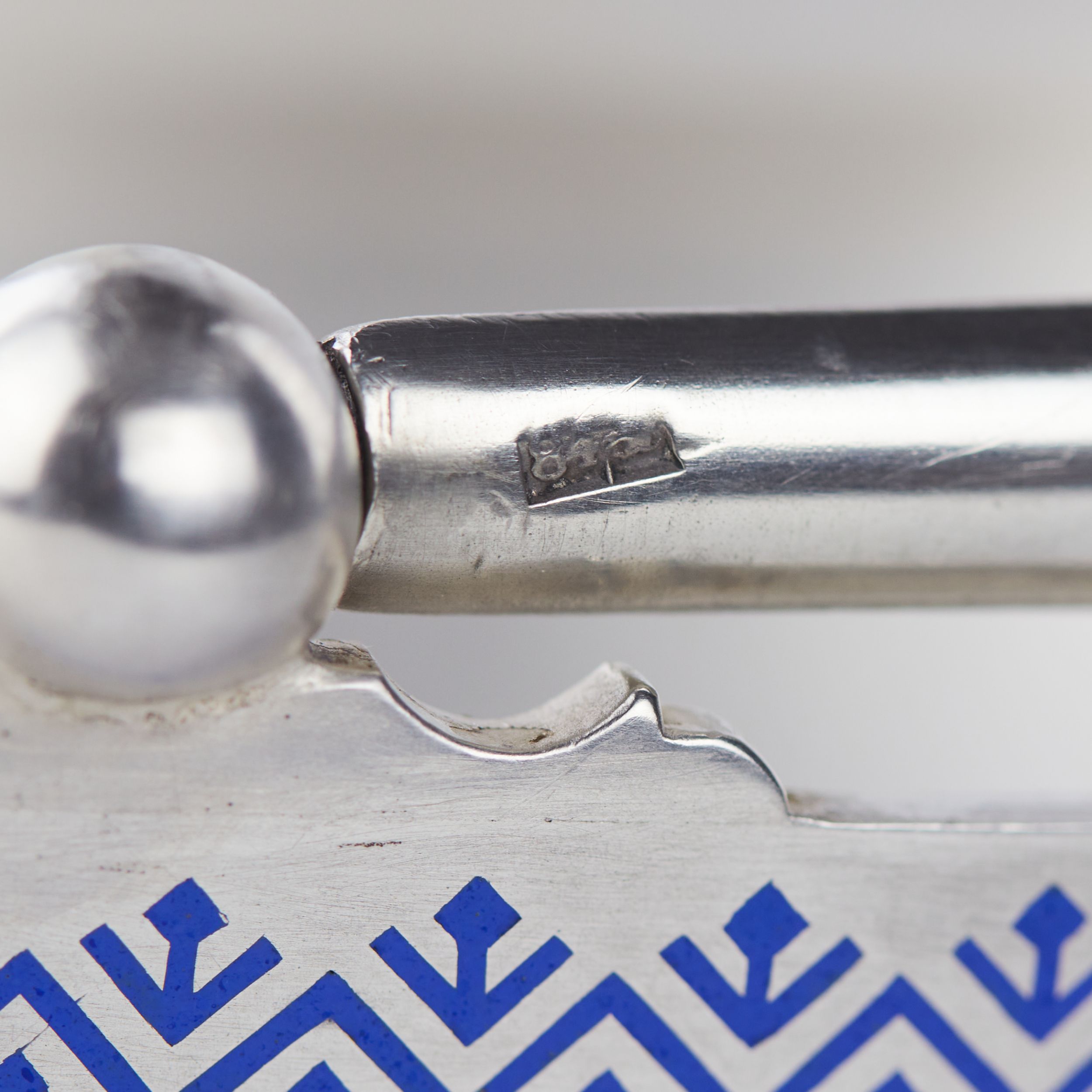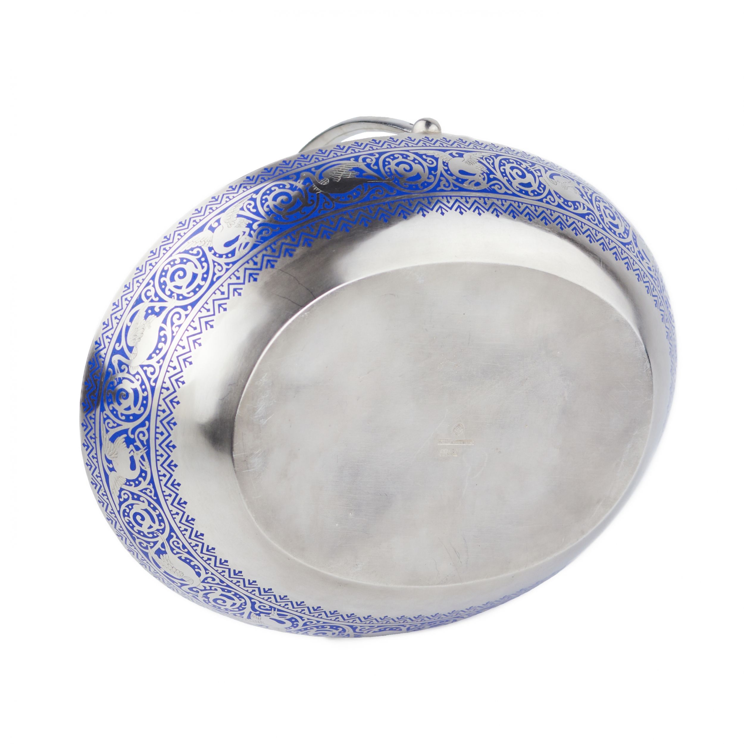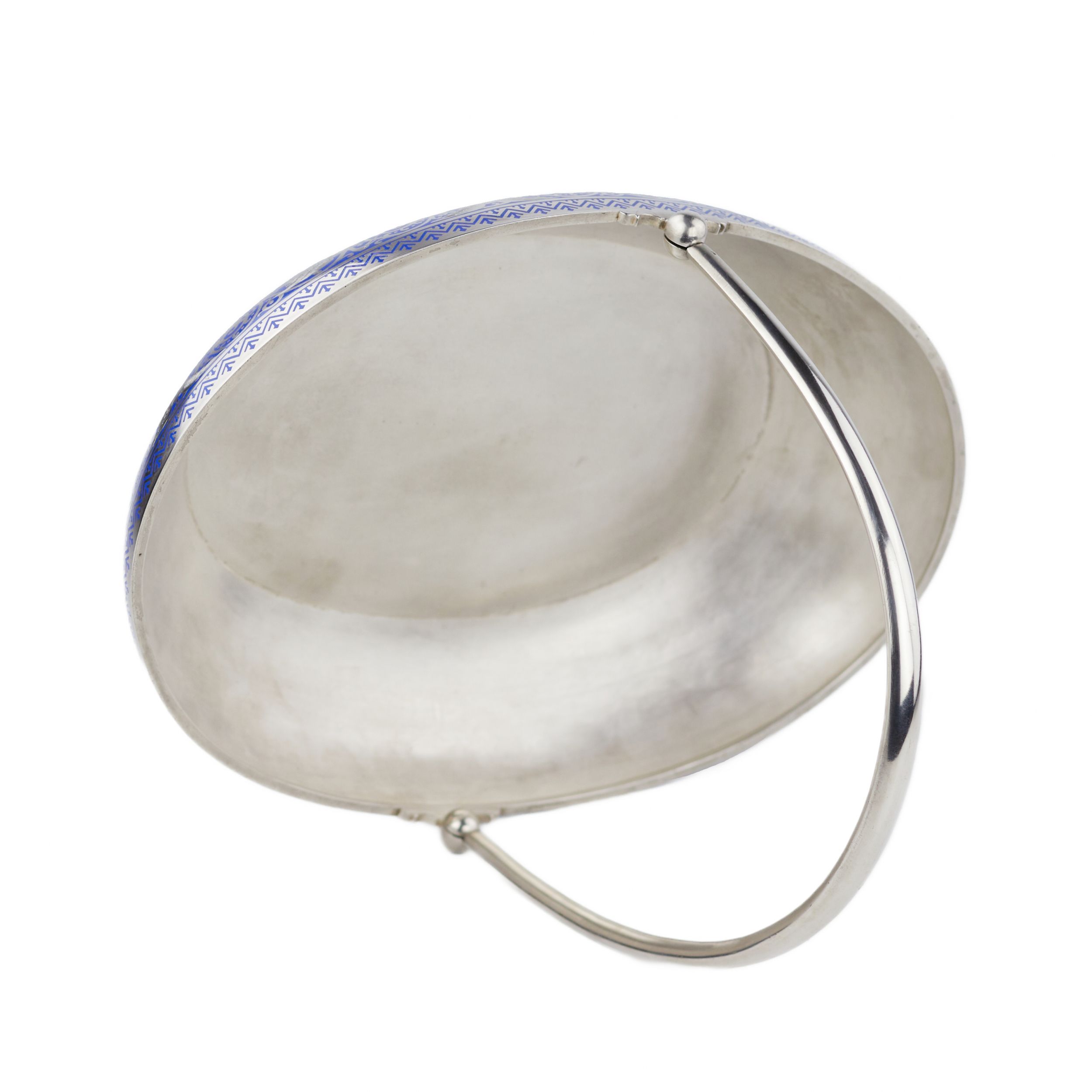 Размеры: 26,6 × 21,6 см, высота без ручки 5,6 см, с ручкой 16,5 см. Вес: 515 г. Состояние: Хорошее. Серебро с благородной патиной, эмали сохранили насыщенность цвета и целостность покрытия. Незначительные следы бытования на внутренней поверхности. Происхождение: Частное европейское собрание.