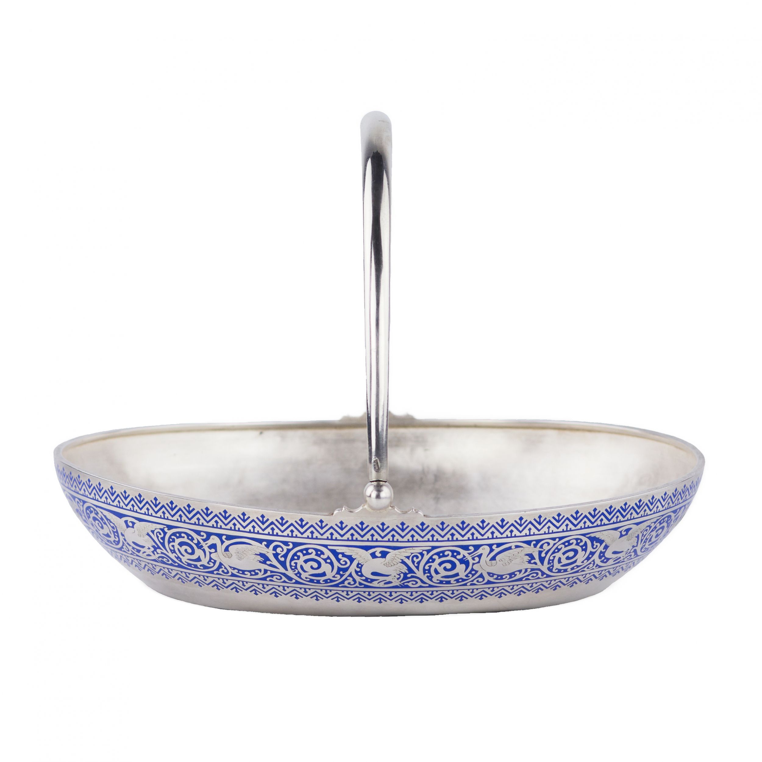 Овальная серебряная корзина для фруктов с высокой подвижной ручкой, выполненная в мастерской Павла Овчинникова — поставщика Императорского двора. Корпус украшен по окружности изысканным фризом насыщенного кобальтового цвета с изображениями стилизованных птиц в витиеватом орнаменте неорусского стиля, выполненным в технике выемчатой эмали. Ручка из гладкого серебра соединена шарообразными накладками, формируя гармоничное завершение композиции. Внутренняя поверхность корзины частично позолочена.