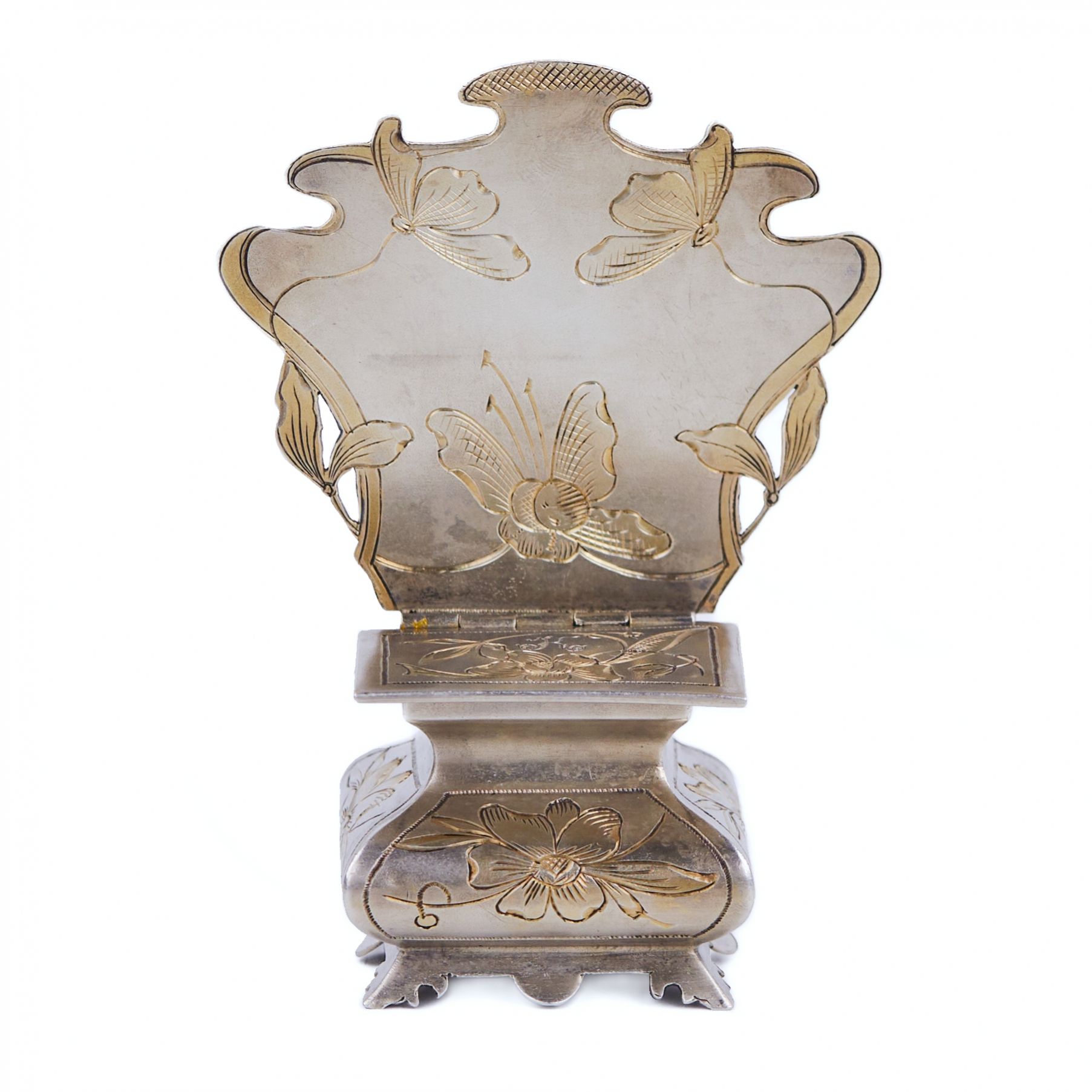 Поверхность украшена тонкой ручной гравировкой с изображениями бабочек и стилизованных растительных мотивов, характерных для декоративного языка эпохи Модерн. Центральную часть спинки занимает крупная бабочка с раскрытыми крыльями, дополненная изображениями цветов и плавно извивающихся стеблей. Орнамент продолжается на гранях основания, создавая единый декоративный ритм и подчёркивая пластичность формы изделия.