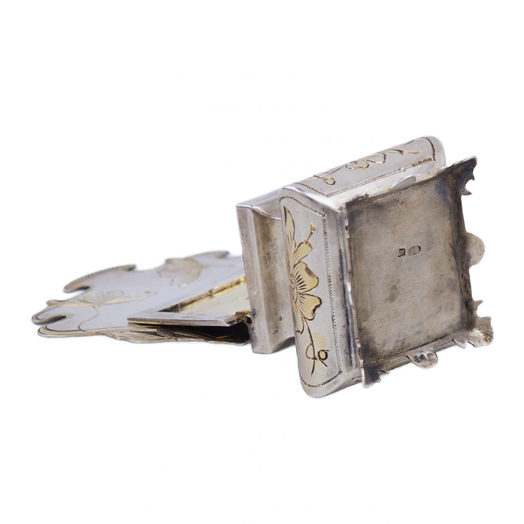 Сиденье выполнено в виде откидной крышки на шарнире, открывающей внутреннюю ёмкость для соли. Основание установлено на фигурных ножках, формирующих устойчивую декоративную опору. Компактные размеры и выразительная пластика делают предмет характерным образцом камерной серебряной пластики московских мастерских периода русского Модерна.